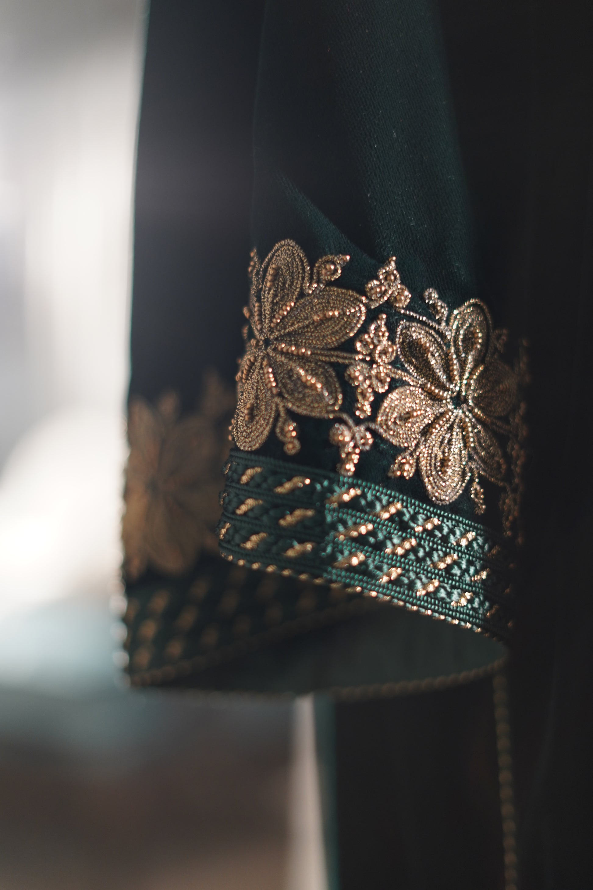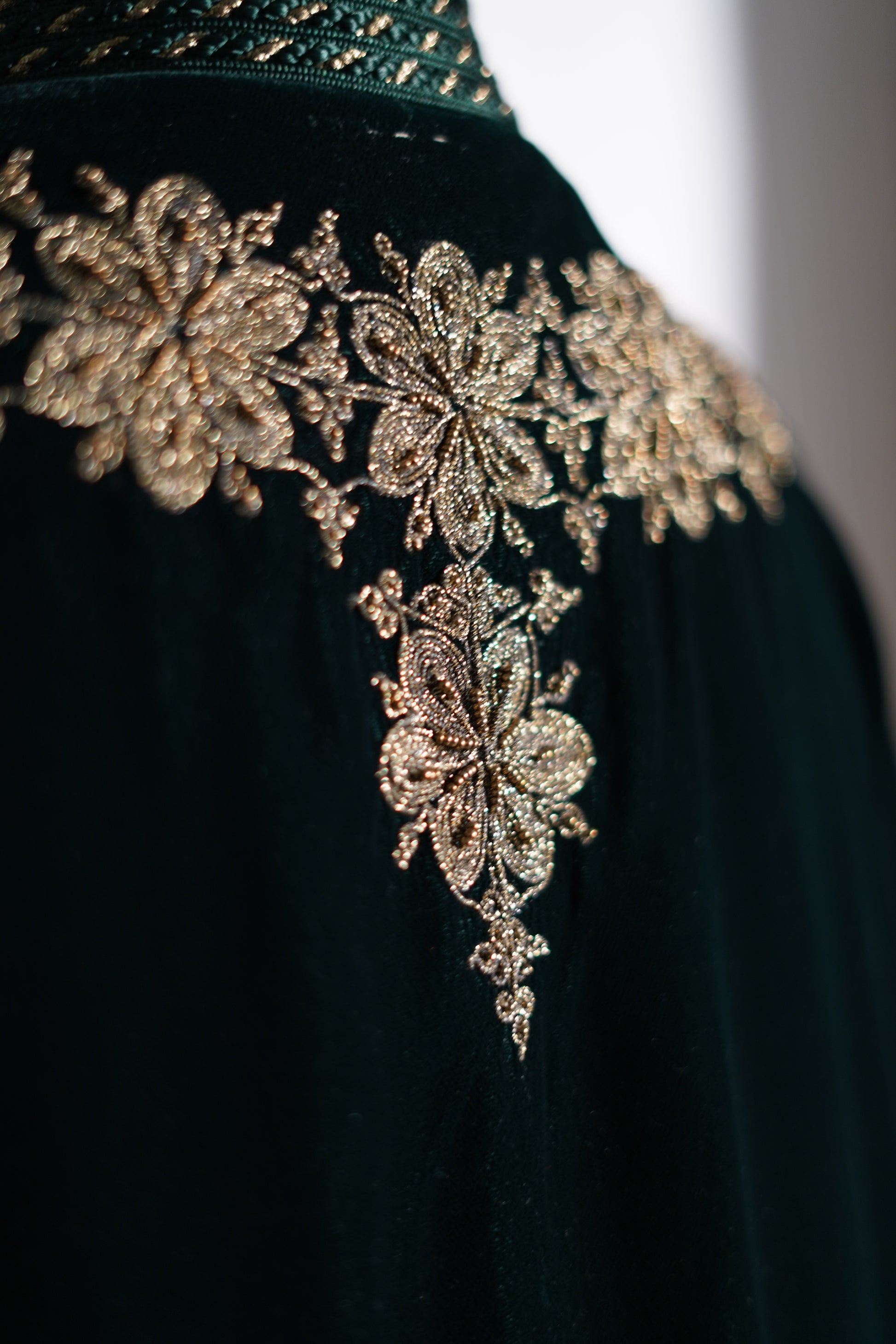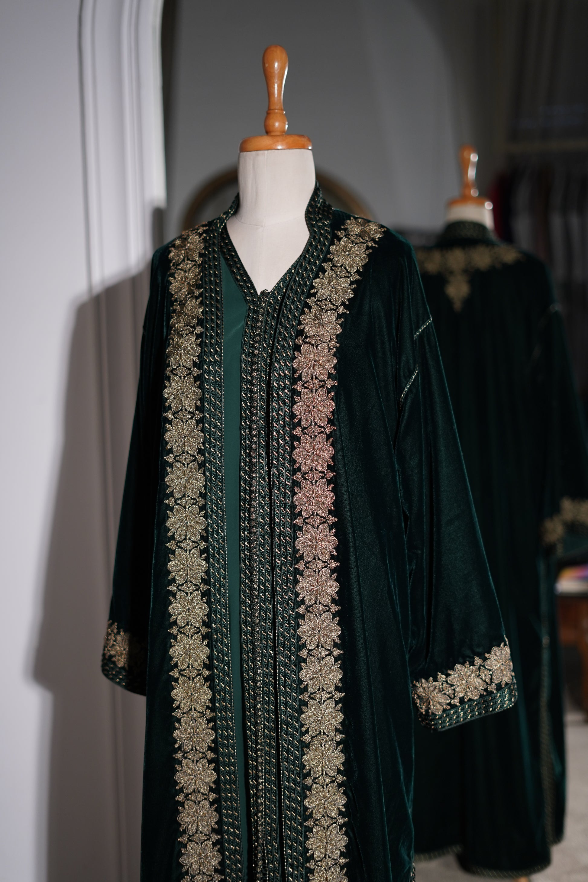 FR🇫🇷: Un caftan majestueux en velours émeraude, magnifié par une sfifa dorée et une randa exquise courant sur le devant et les manches. La coupe royale et le col en V évoquent l'héritage des palais marocains, parfait pour les célébrations de l'Aïd.