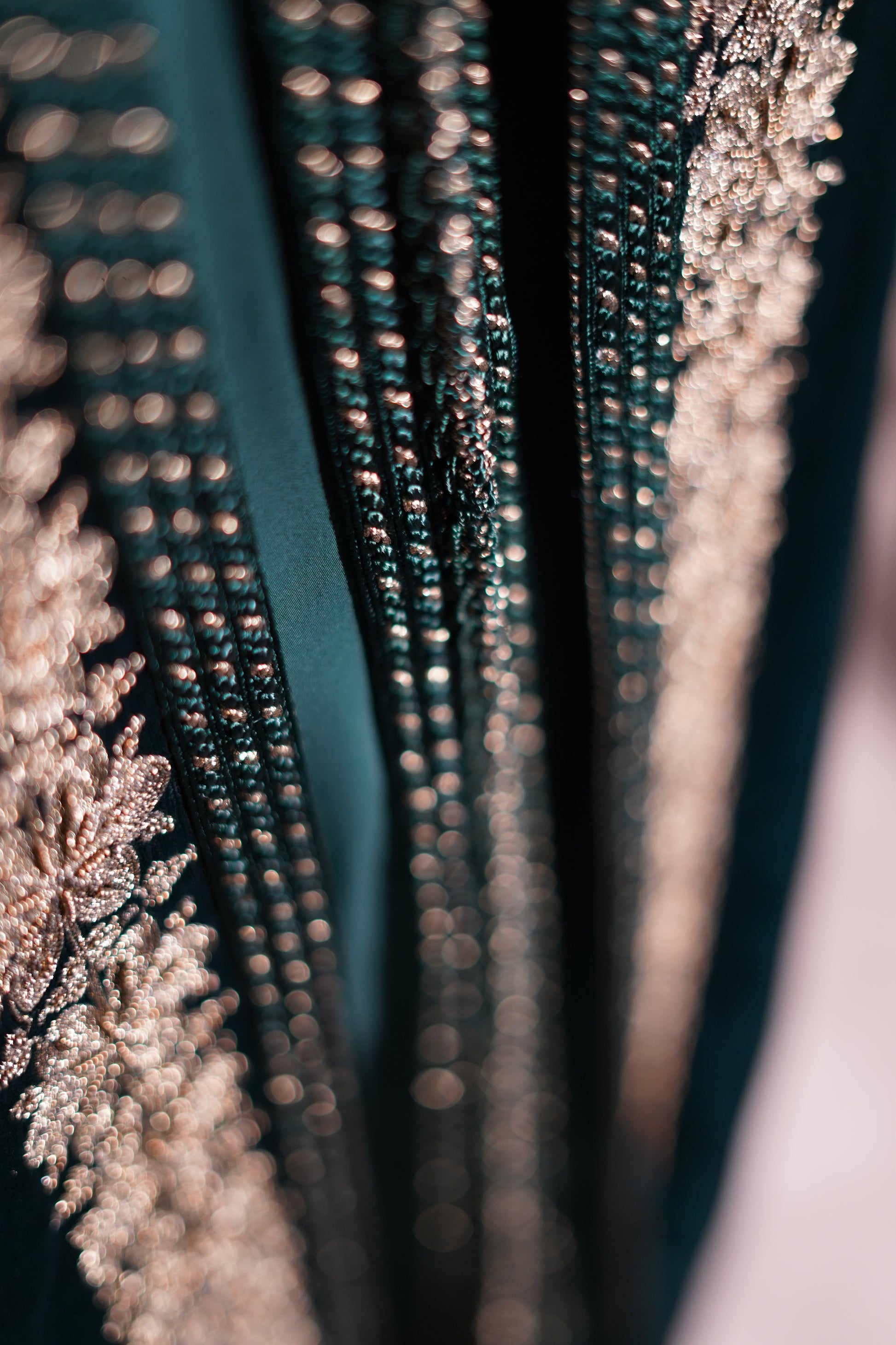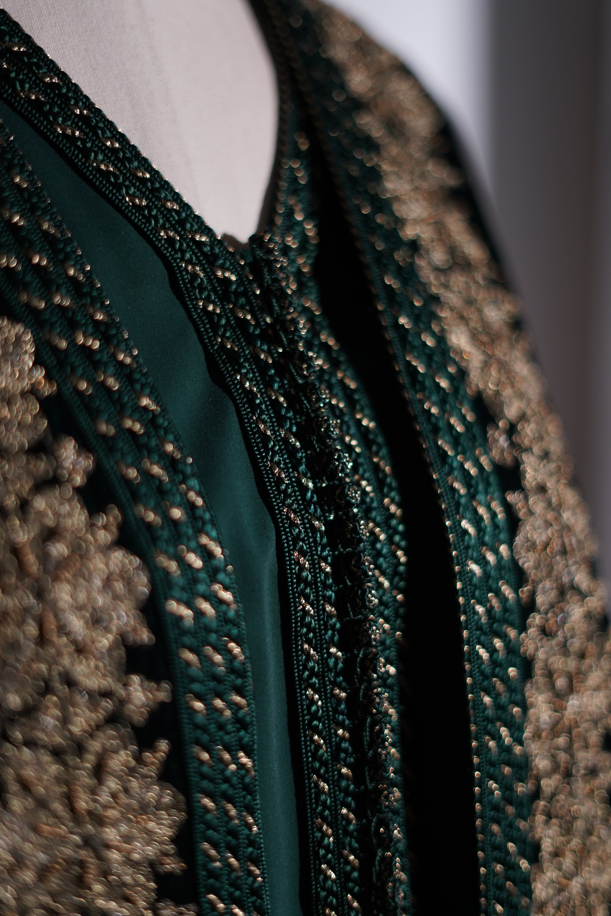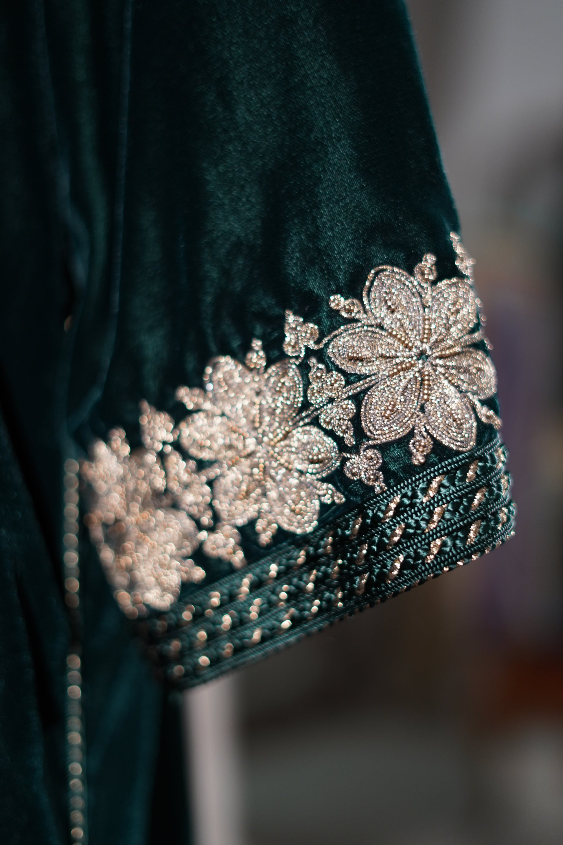 FR🇫🇷: Un caftan majestueux en velours émeraude, magnifié par une sfifa dorée et une randa exquise courant sur le devant et les manches. La coupe royale et le col en V évoquent l'héritage des palais marocains, parfait pour les célébrations de l'Aïd.