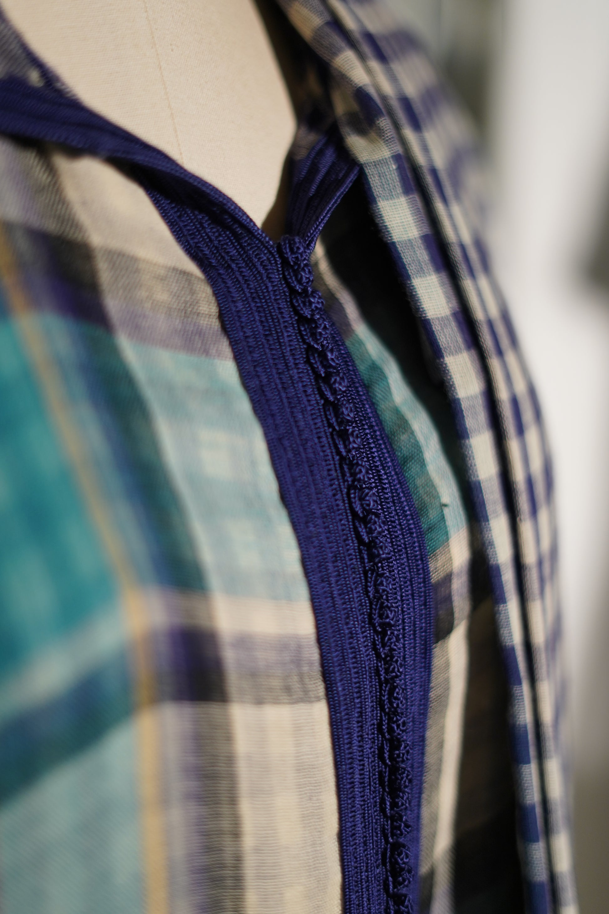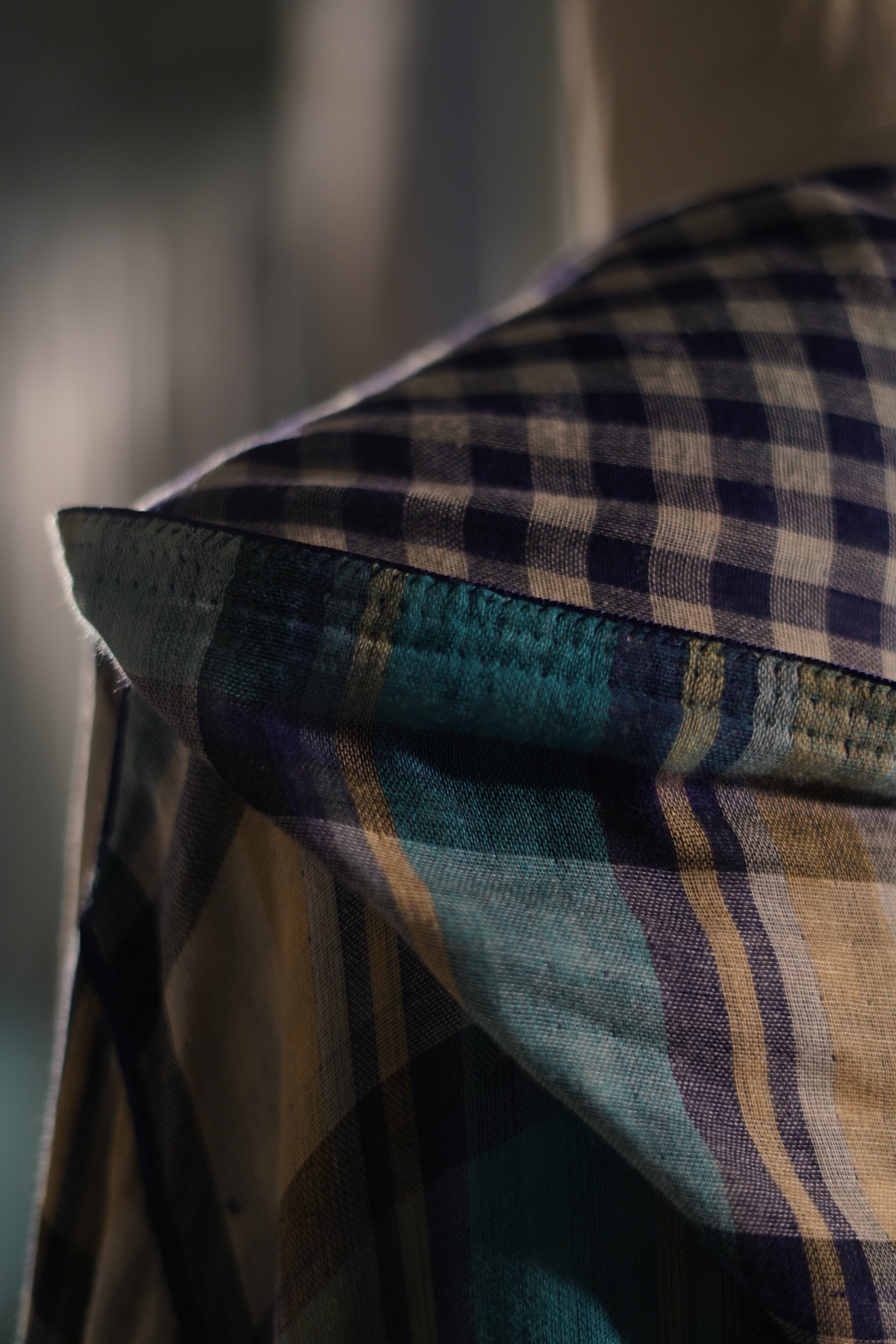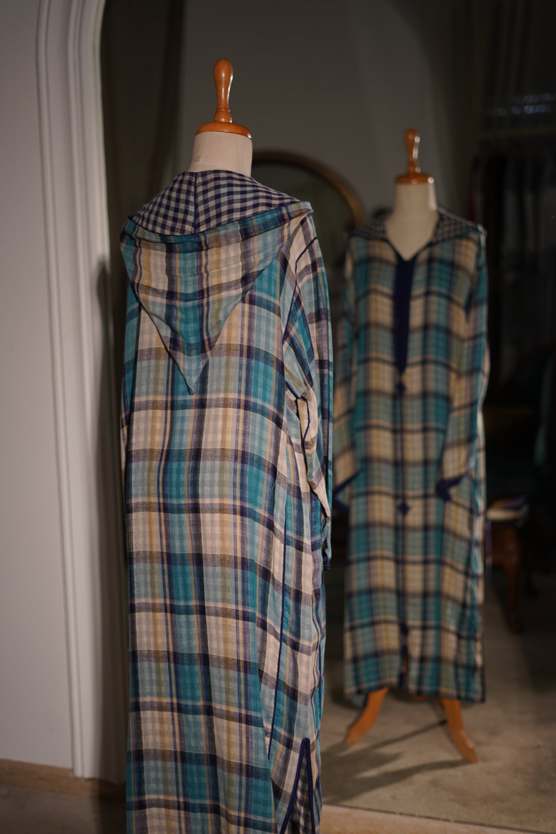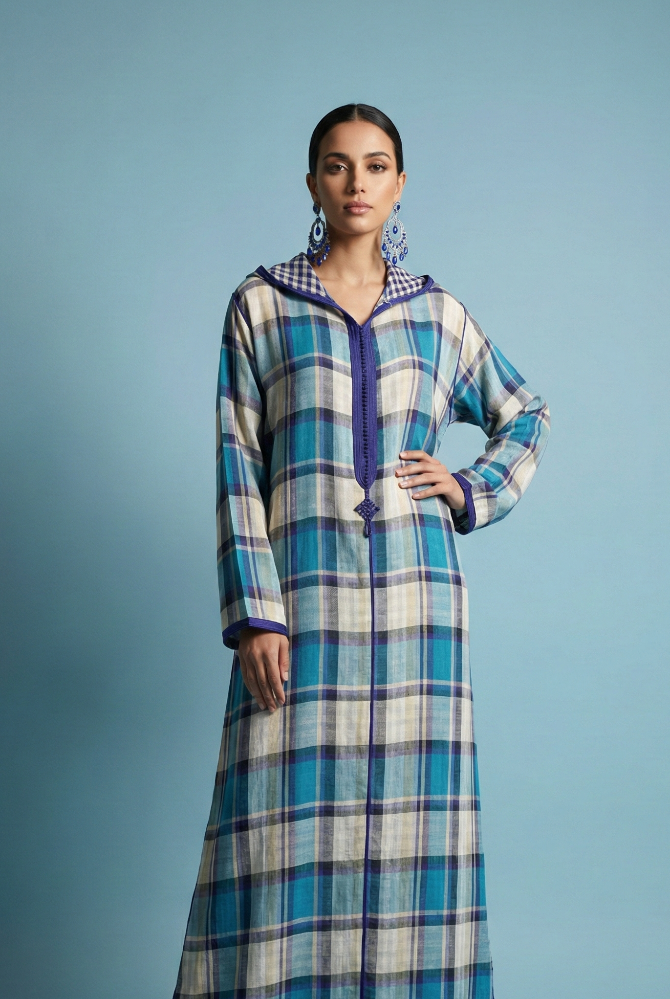 EN🇬🇧: A fresh and vibrant jellaba in Mediterranean blue and cream plaid, featuring a classic hooded silhouette with navy trim accents. The lightweight fabric and cheerful pattern make it ideal for casual elegance during warm Ramadan evenings.