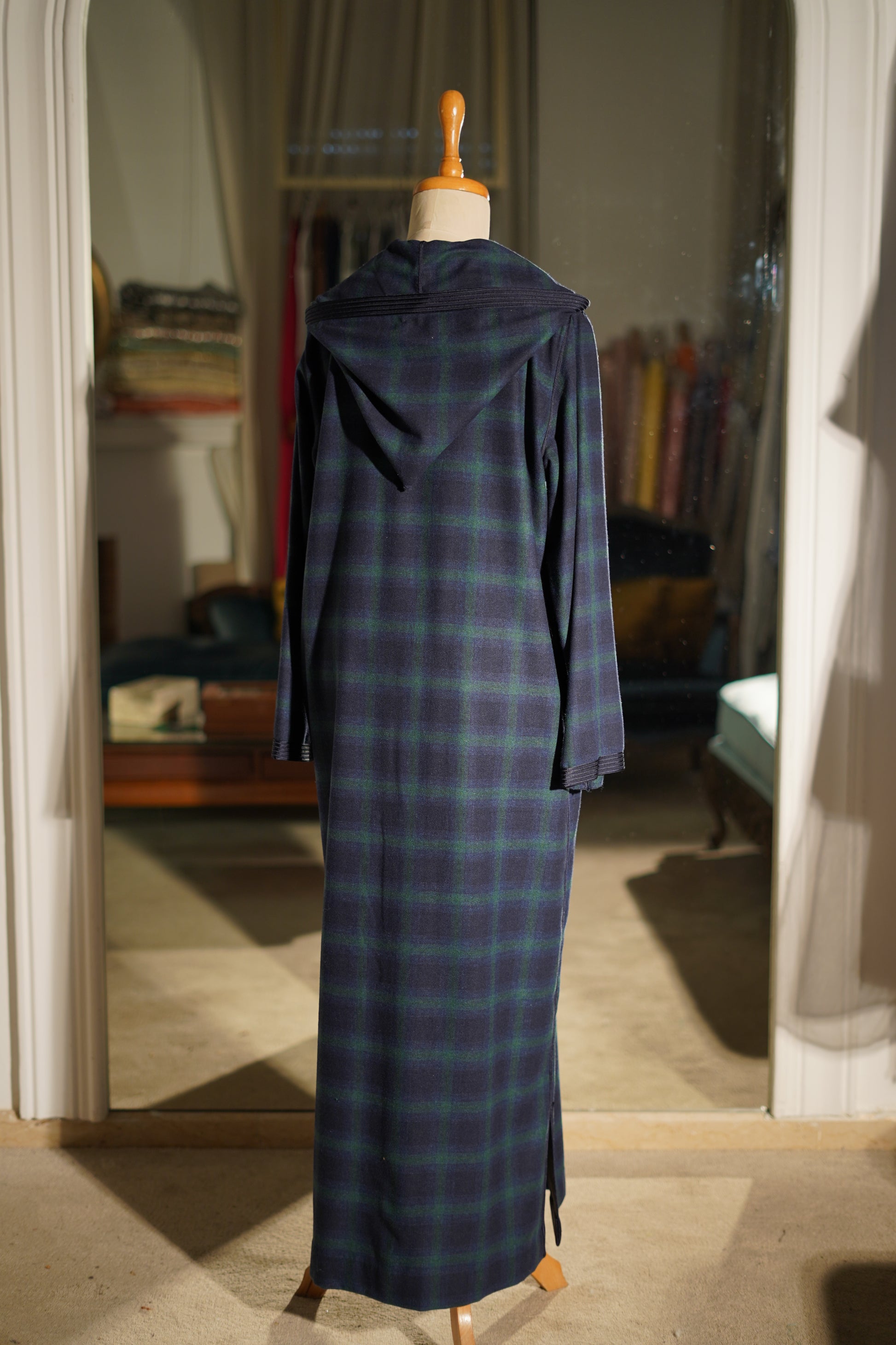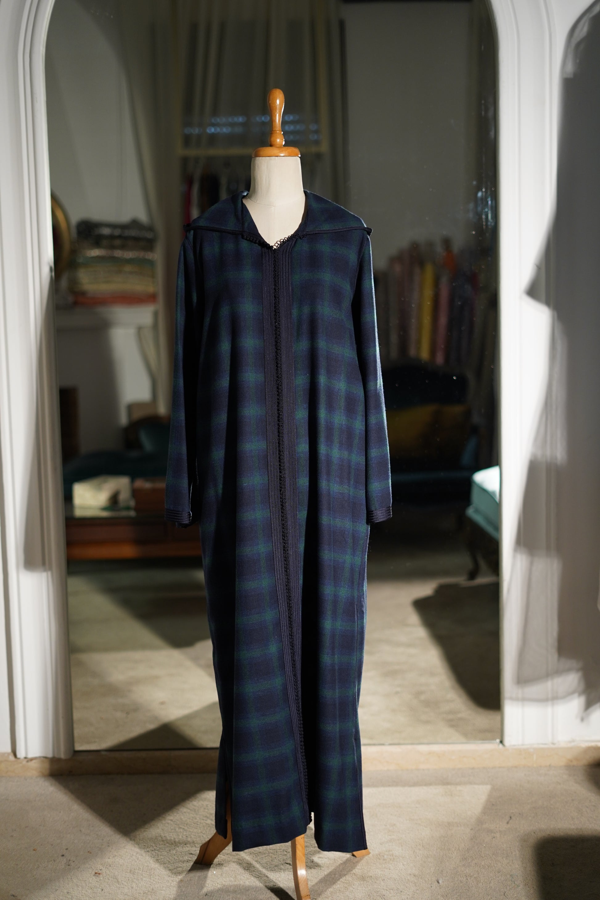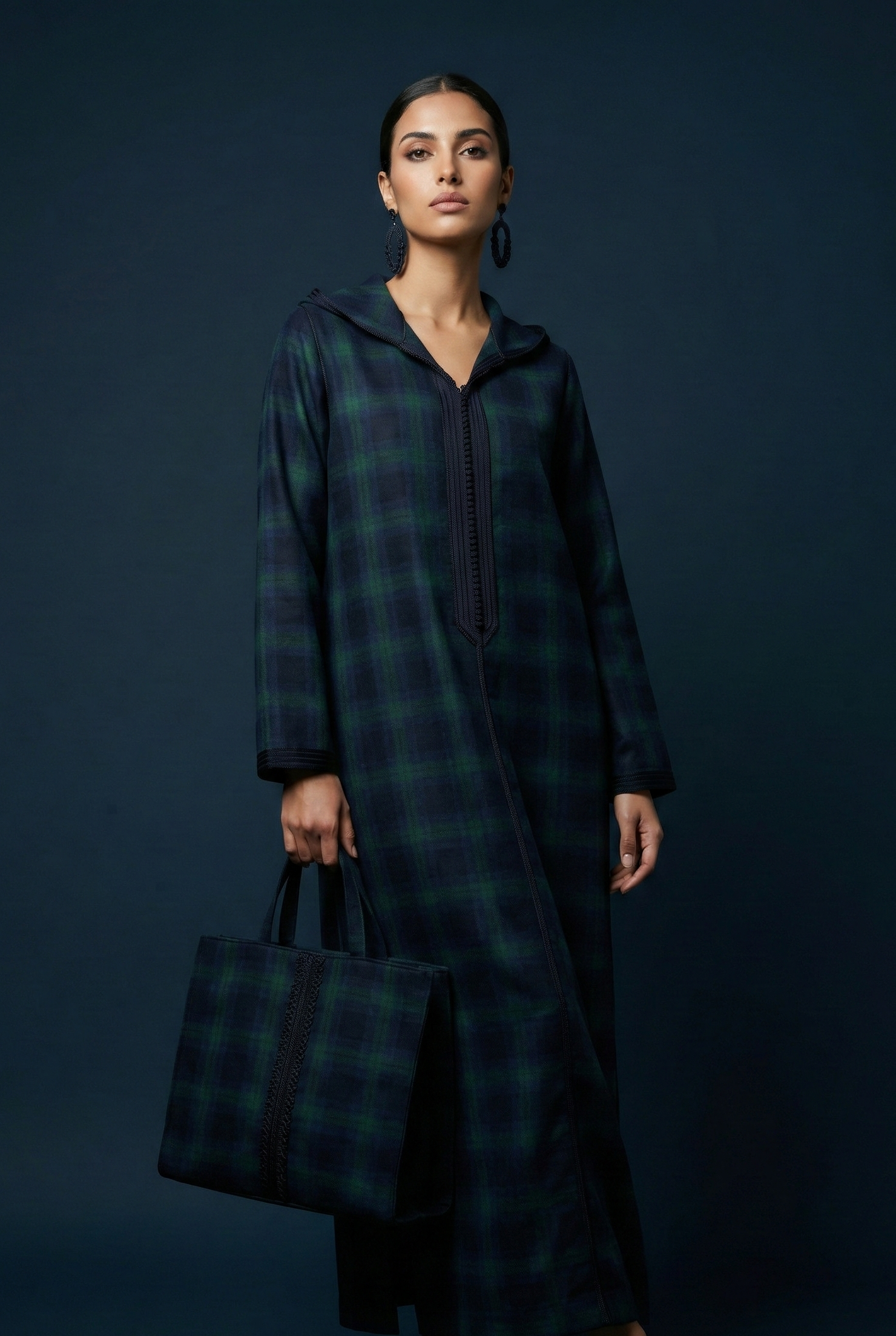 EN🇬🇧: A sophisticated midnight blue jellaba featuring an elegant tartan pattern in deep navy and forest green tones. The hooded silhouette drapes gracefully with a classic sfifa detail, offering timeless Moroccan elegance with a contemporary edge.