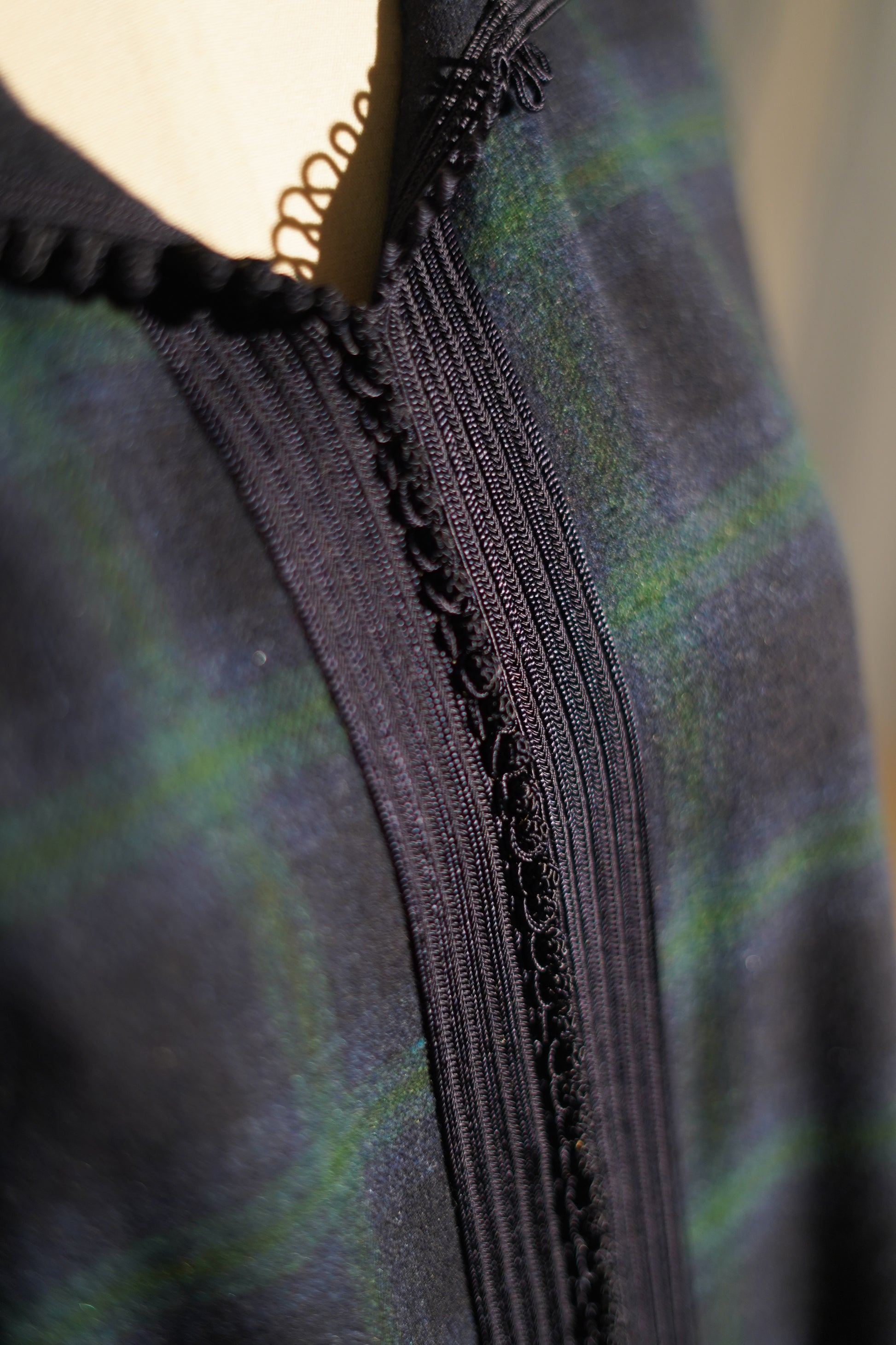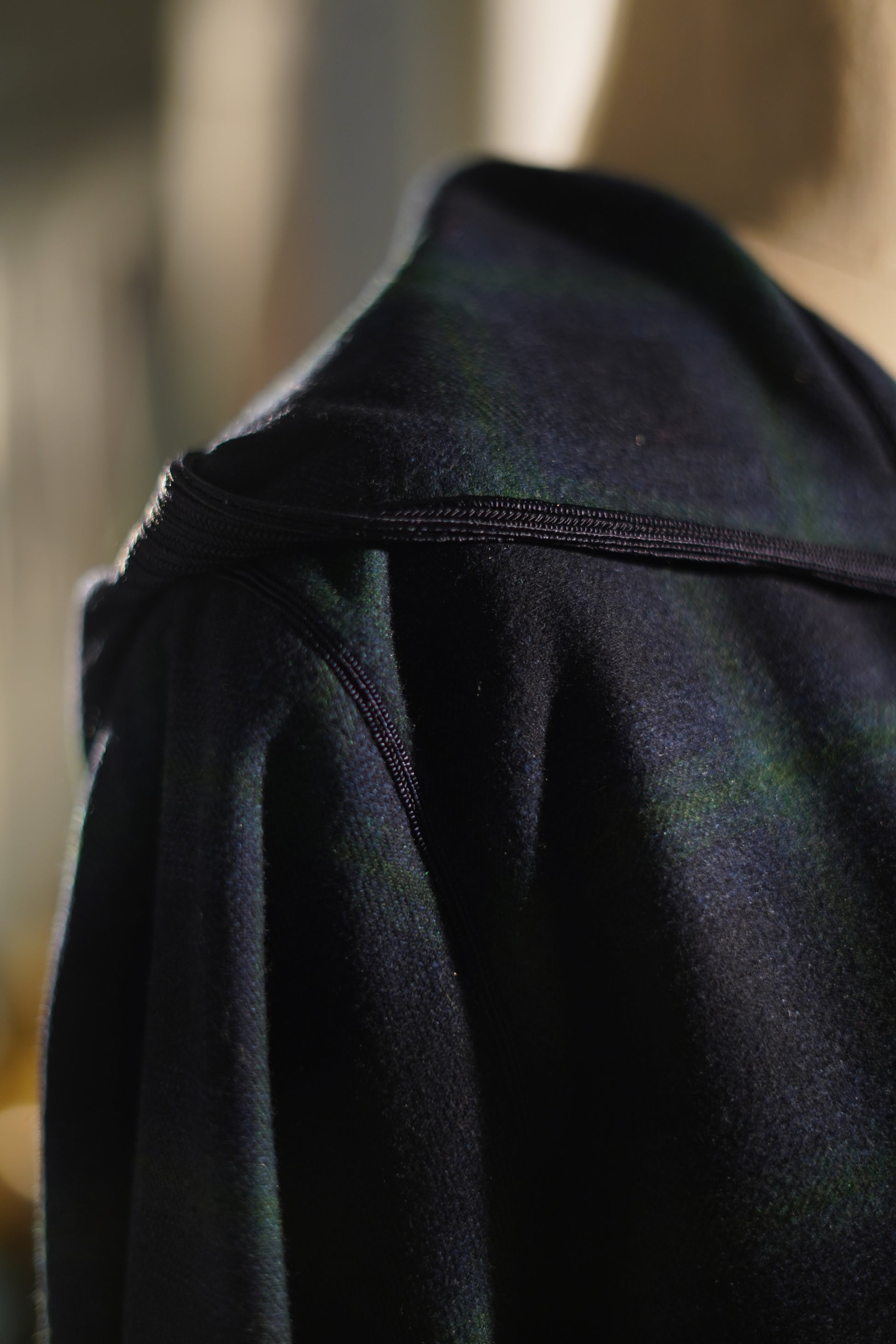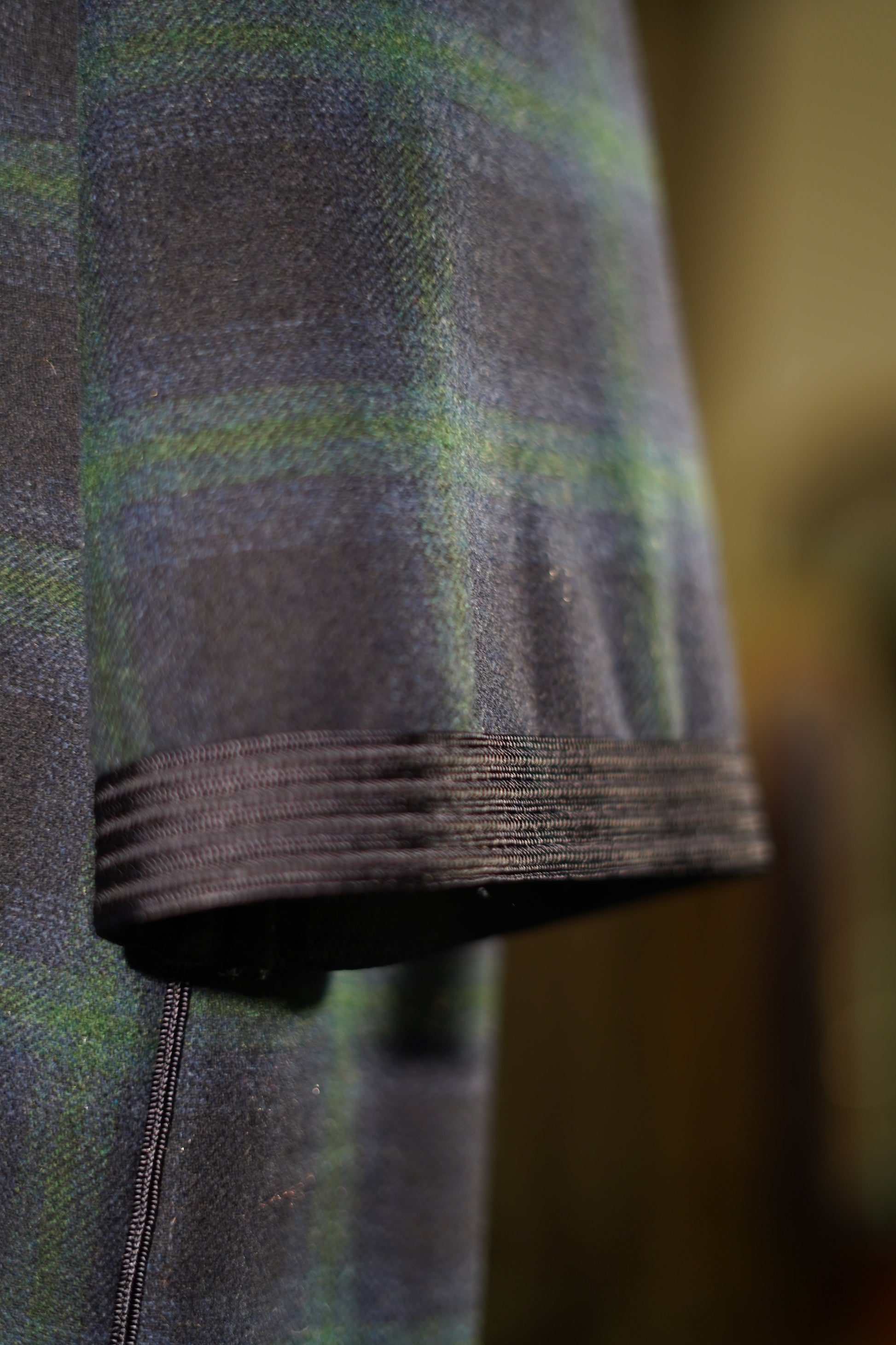 EN🇬🇧: A sophisticated midnight blue jellaba featuring an elegant tartan pattern in deep navy and forest green tones. The hooded silhouette drapes gracefully with a classic sfifa detail, offering timeless Moroccan elegance with a contemporary edge.