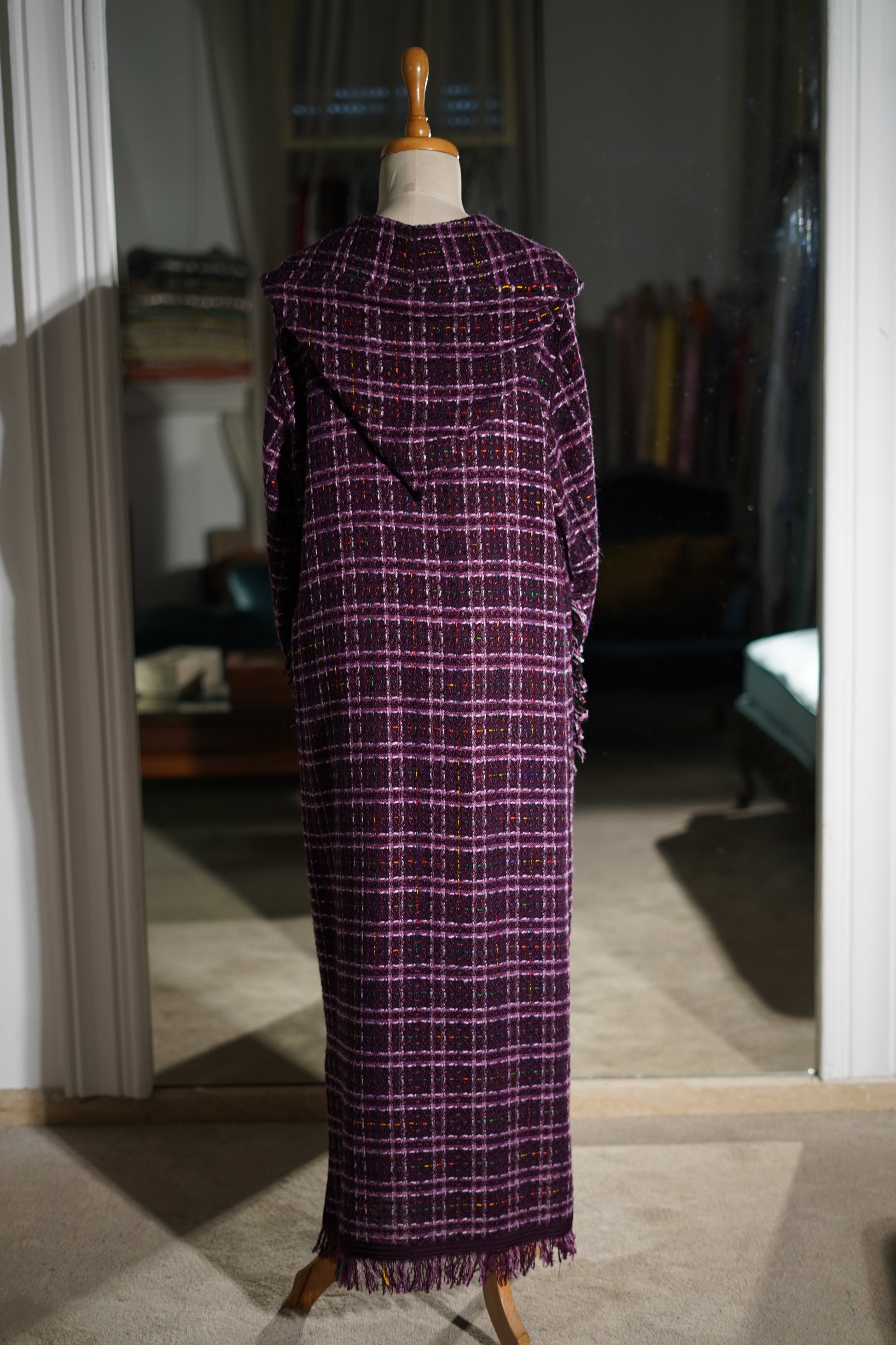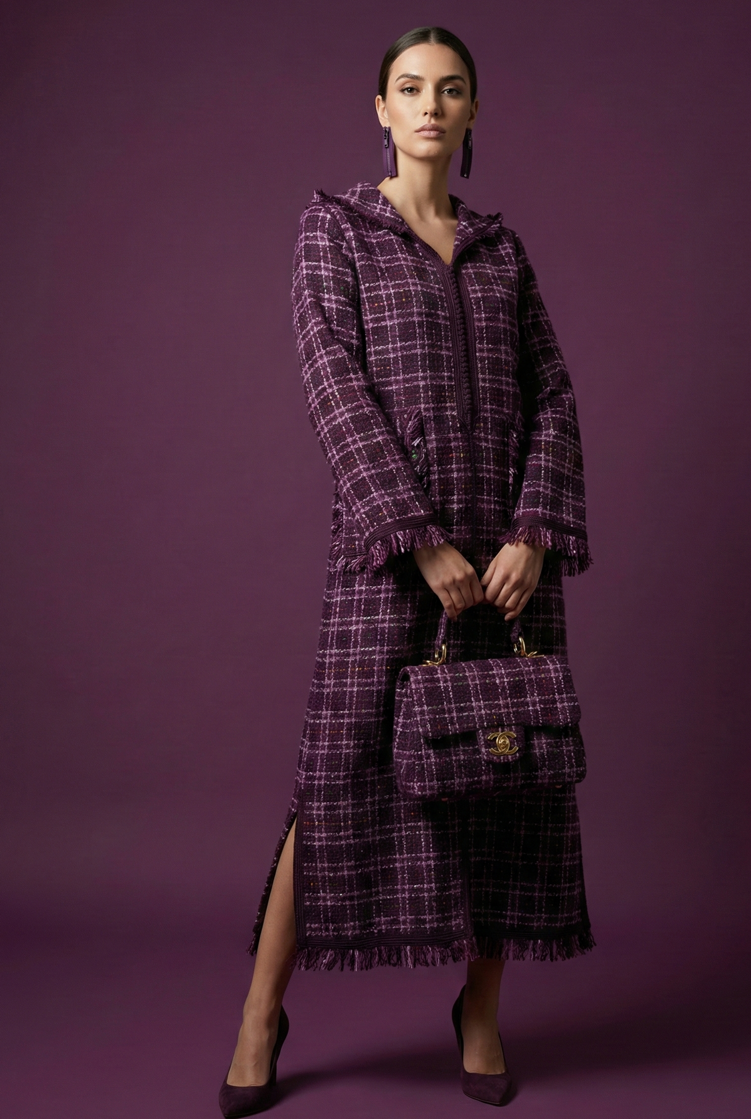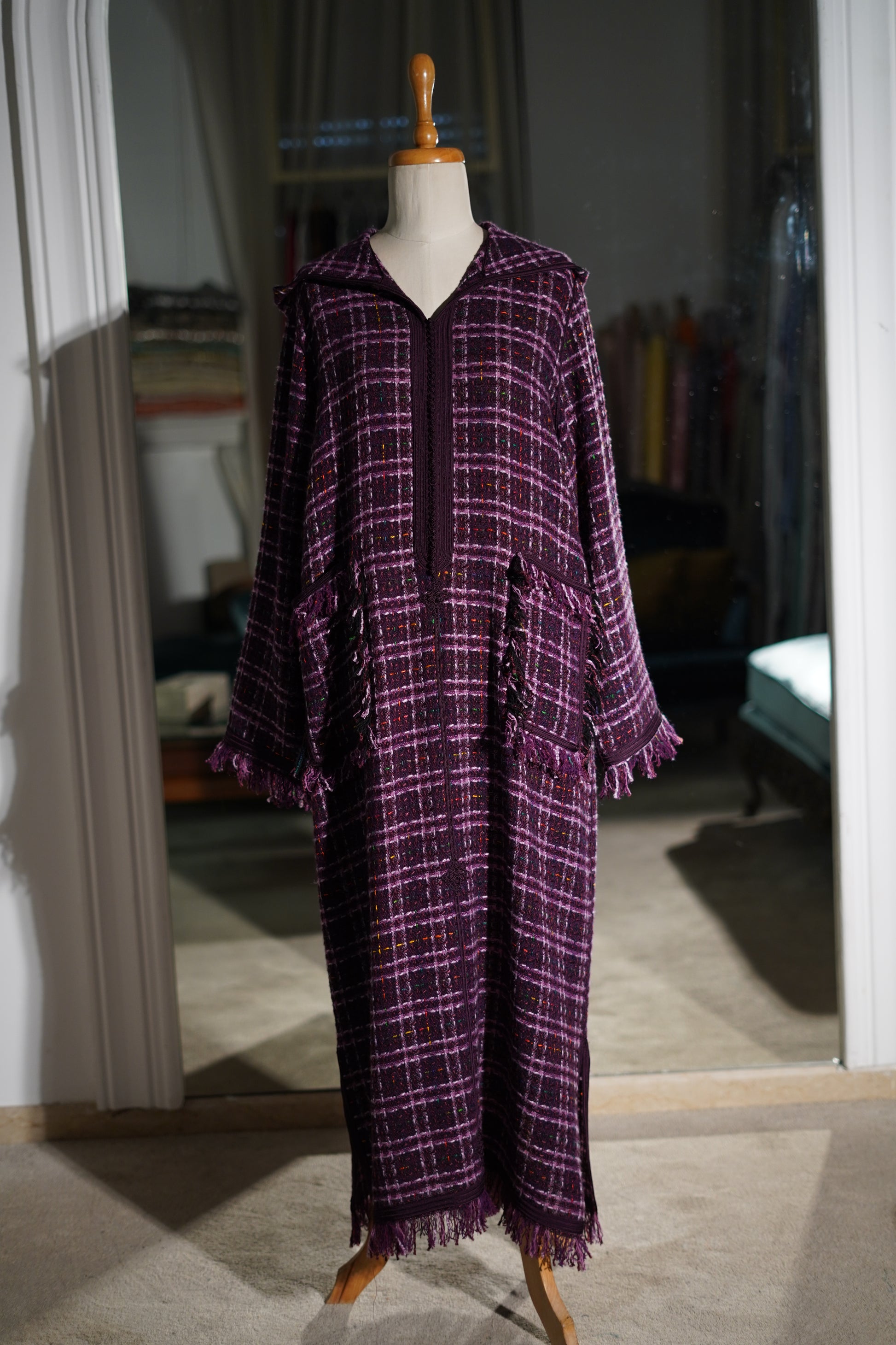 EN🇬🇧: A bold purple and white plaid jellaba in luxurious tweed fabric with elegant fringe detailing. The vibrant violet hue and refined Channel-style construction make this a standout piece for fashion-forward Ramadan celebrations.