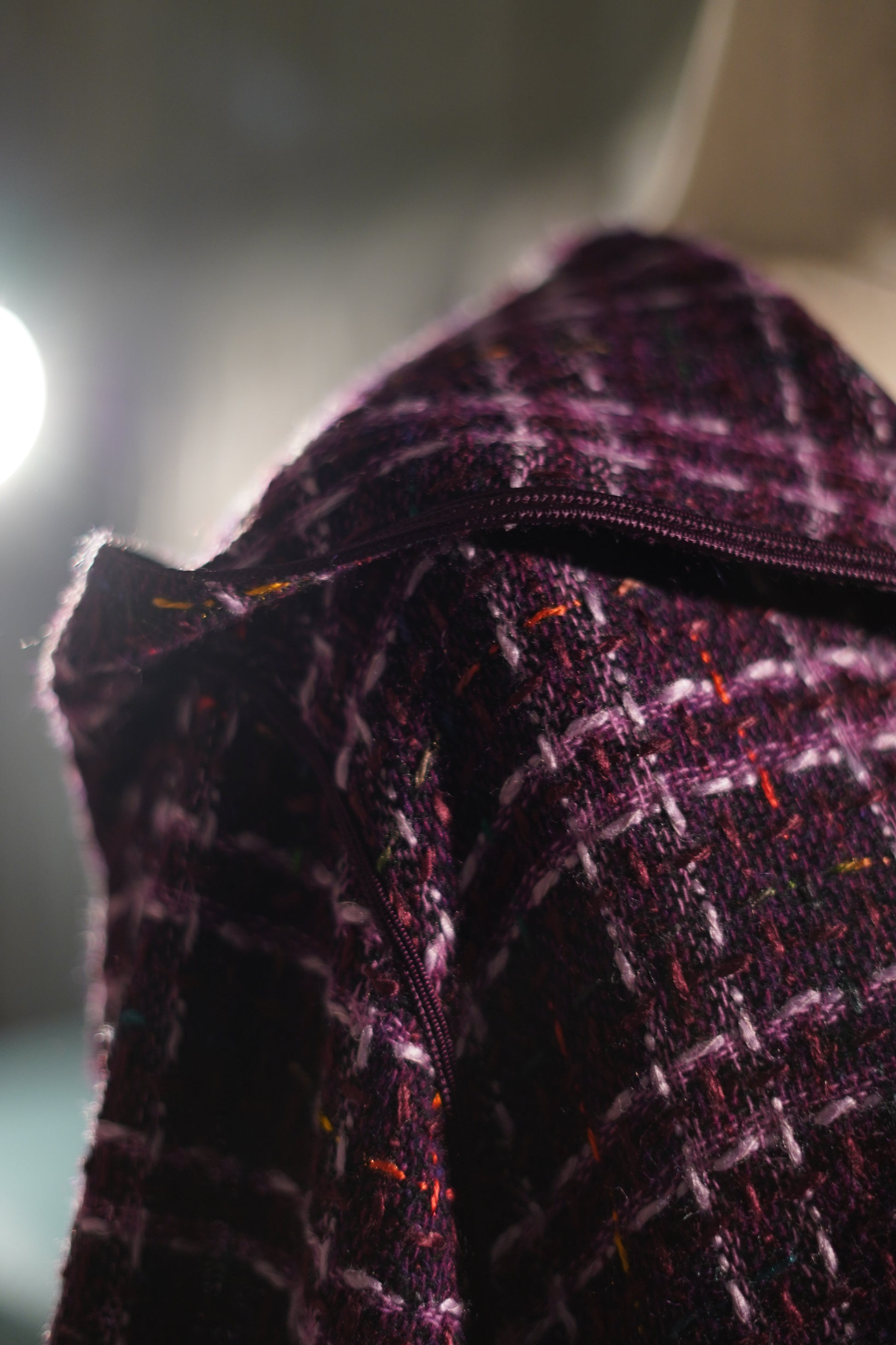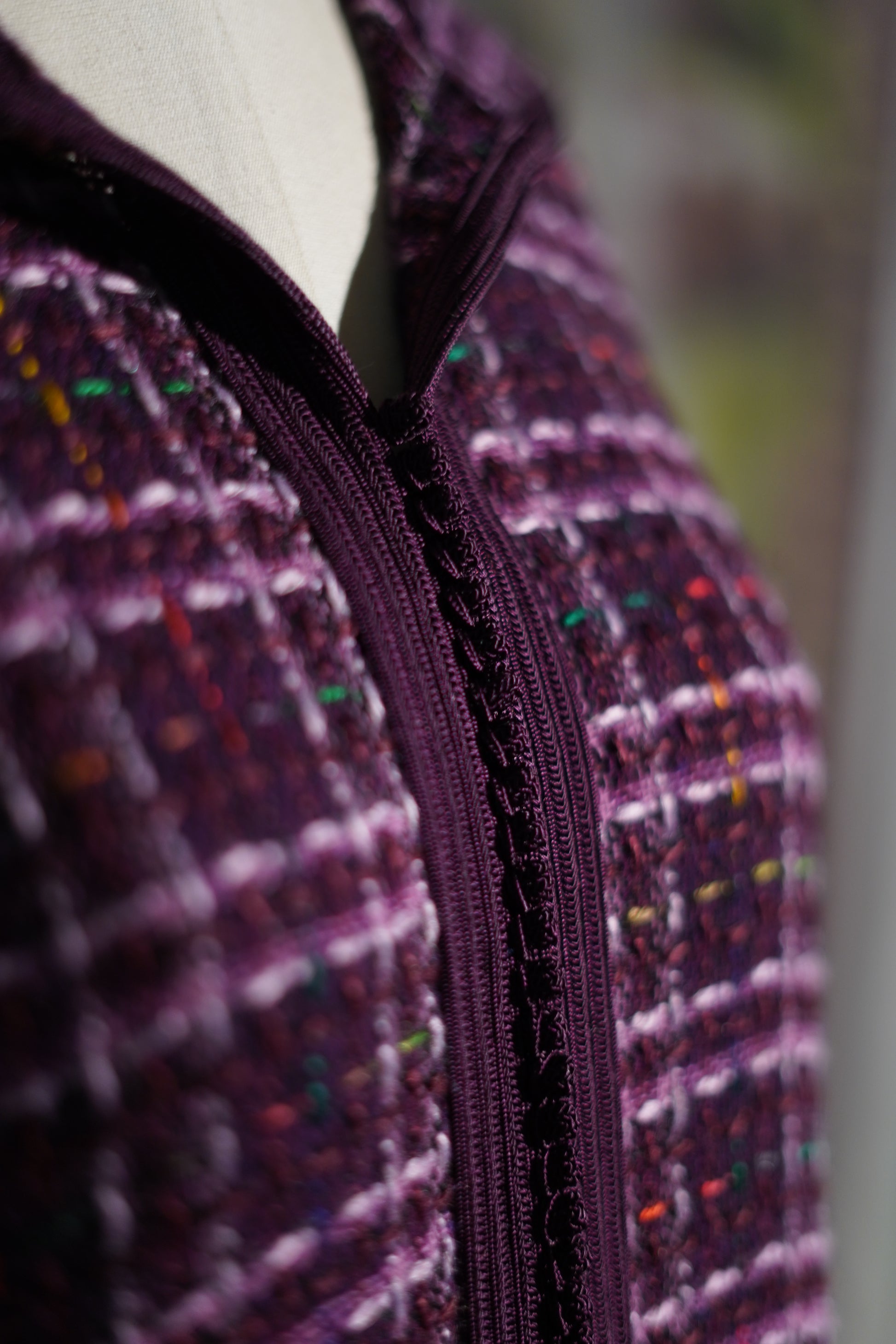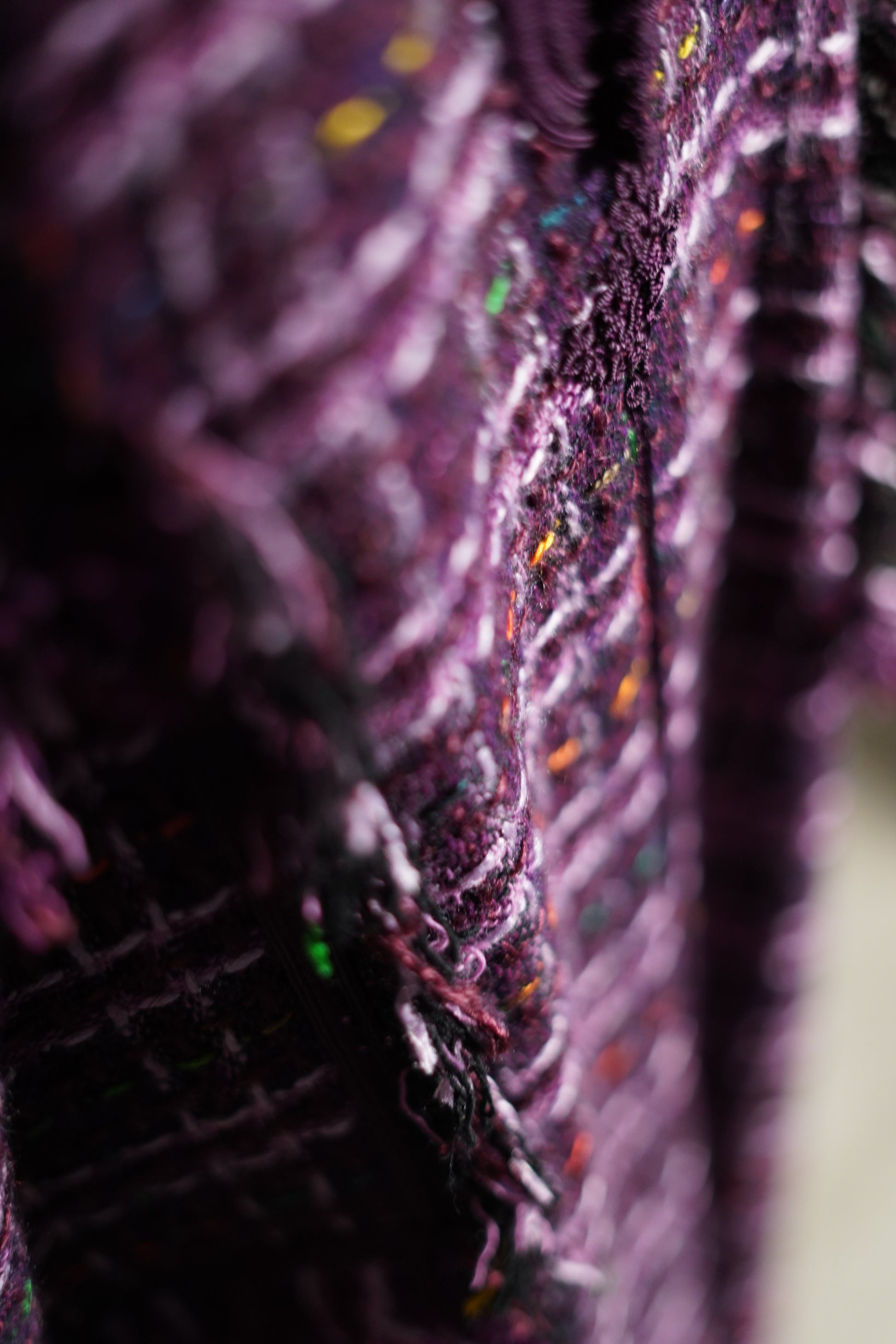 EN🇬🇧: A bold purple and white plaid jellaba in luxurious tweed fabric with elegant fringe detailing. The vibrant violet hue and refined Channel-style construction make this a standout piece for fashion-forward Ramadan celebrations.