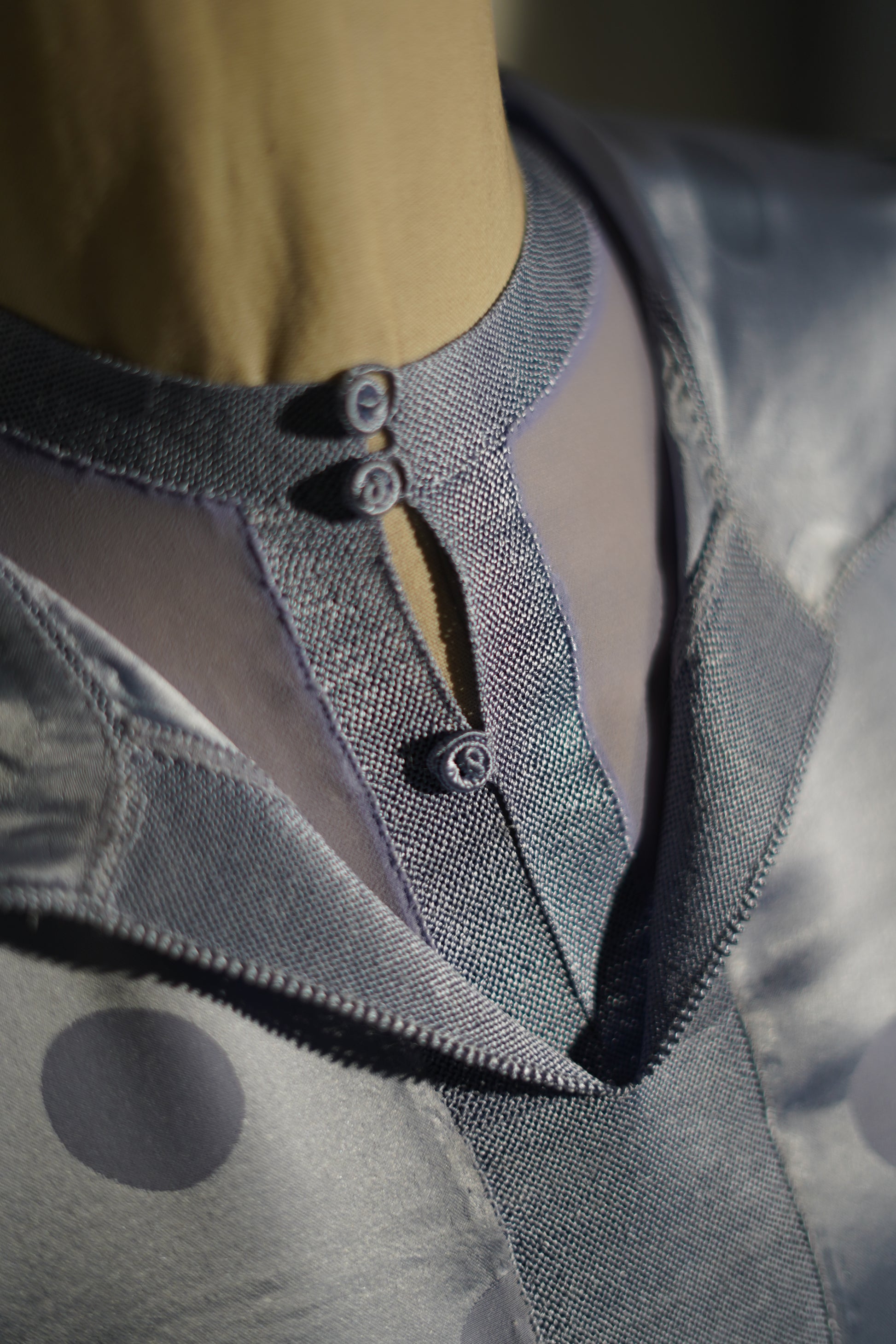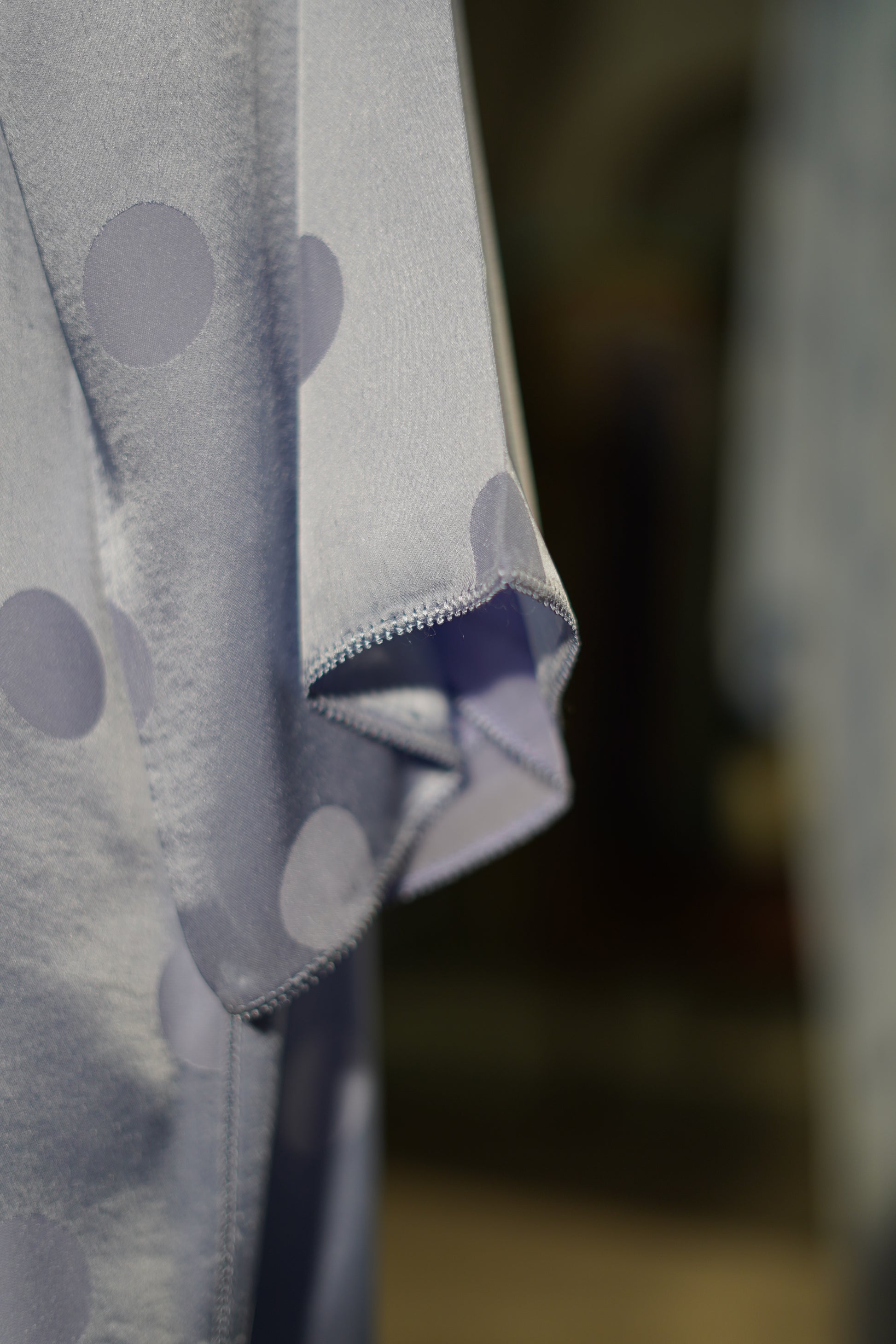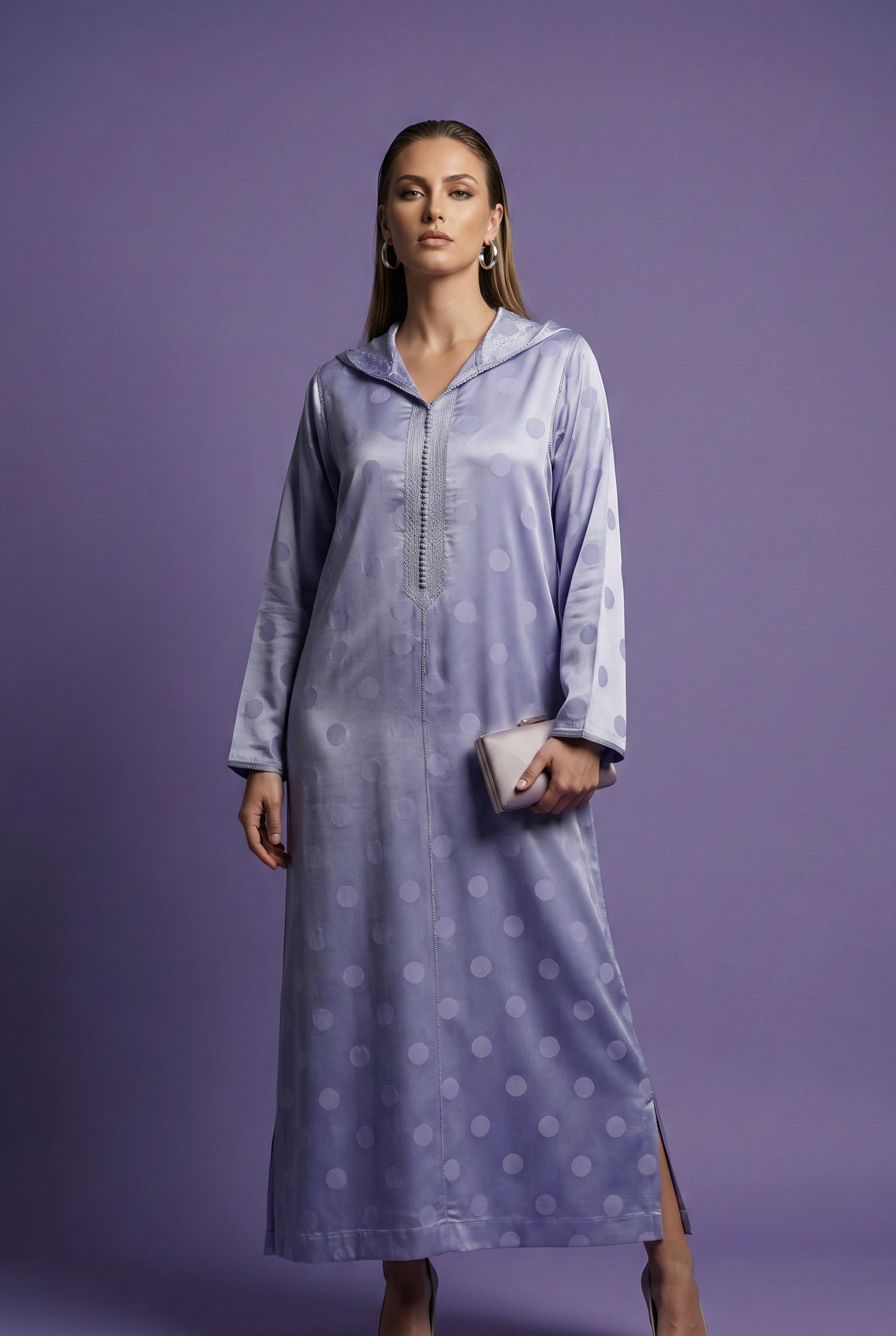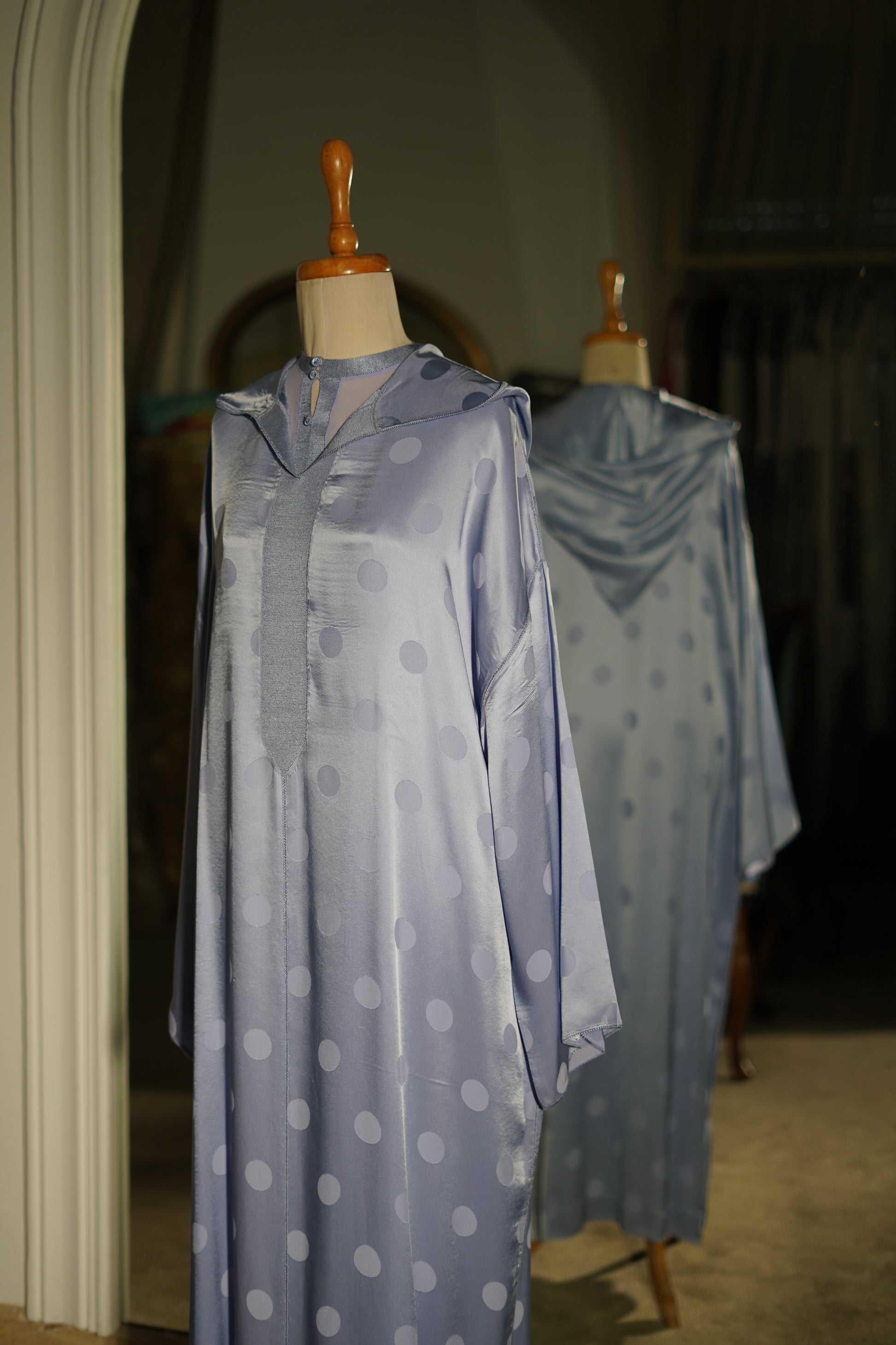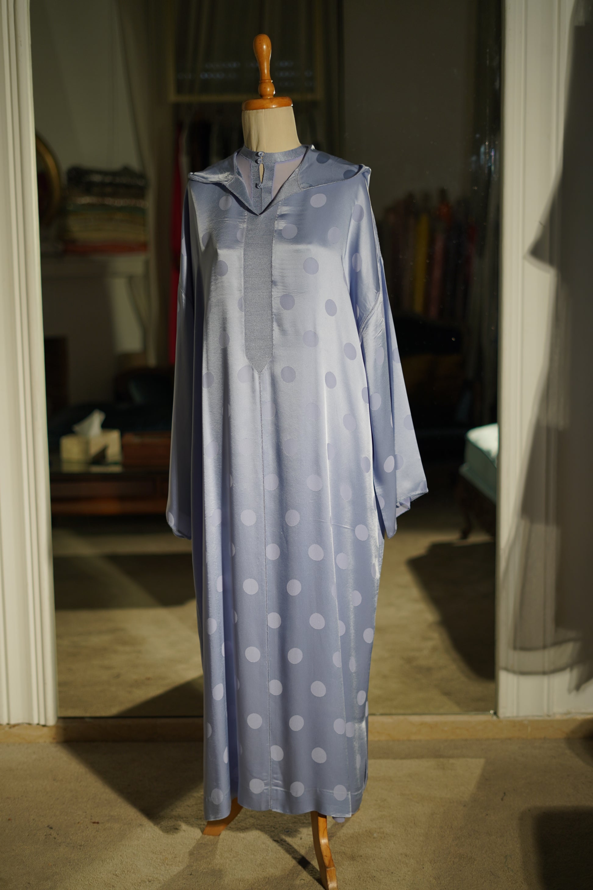 EN 🇬🇧 : This Jellaba features a traditional Moroccan cut, distinguished by its classic hood and subtle sheen. It is characterized by a fluid fabric in a soft sky blue hue embellished with delicate satin polka dots, finished with a matching central sfifa and refined trims.
