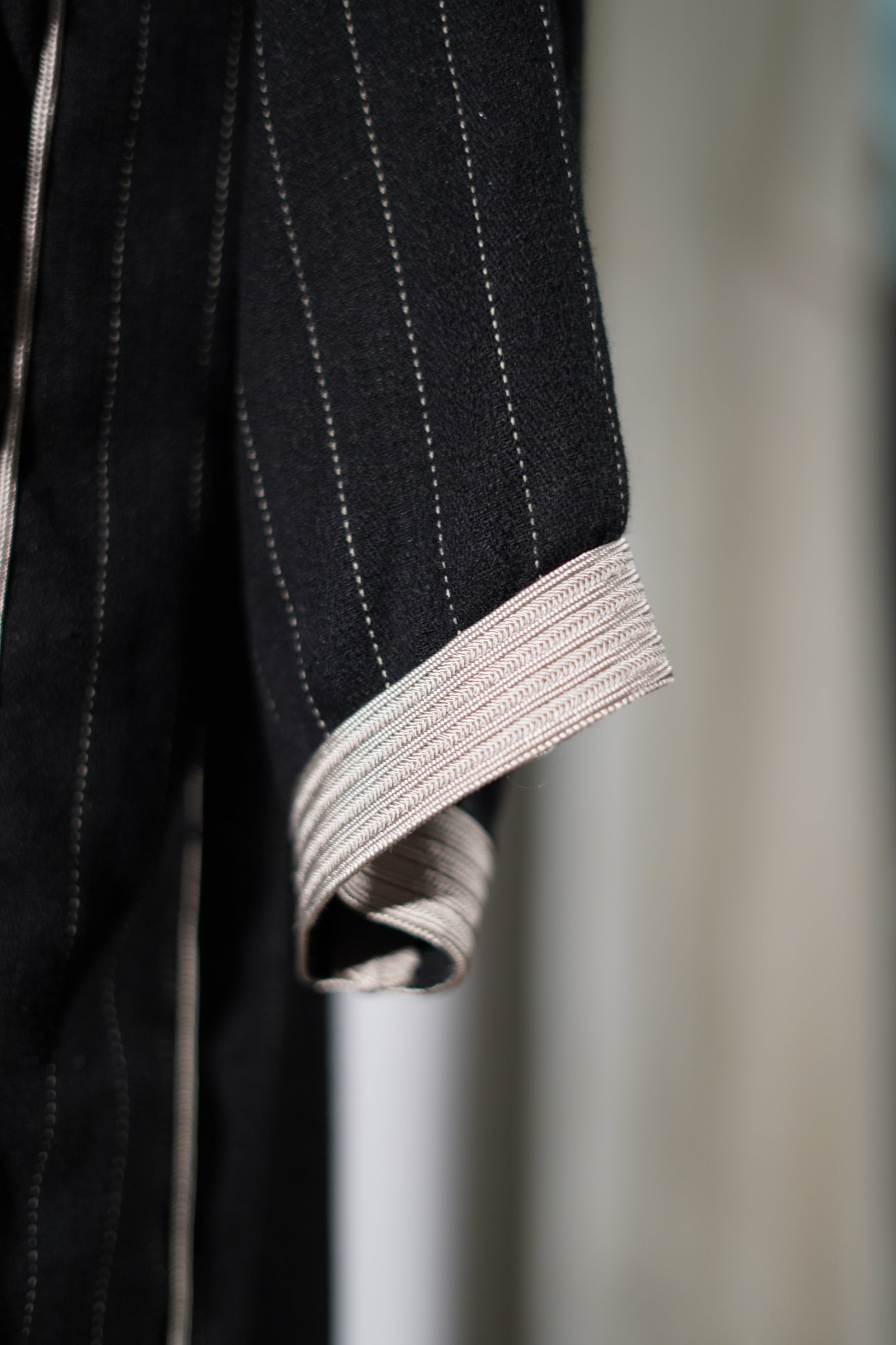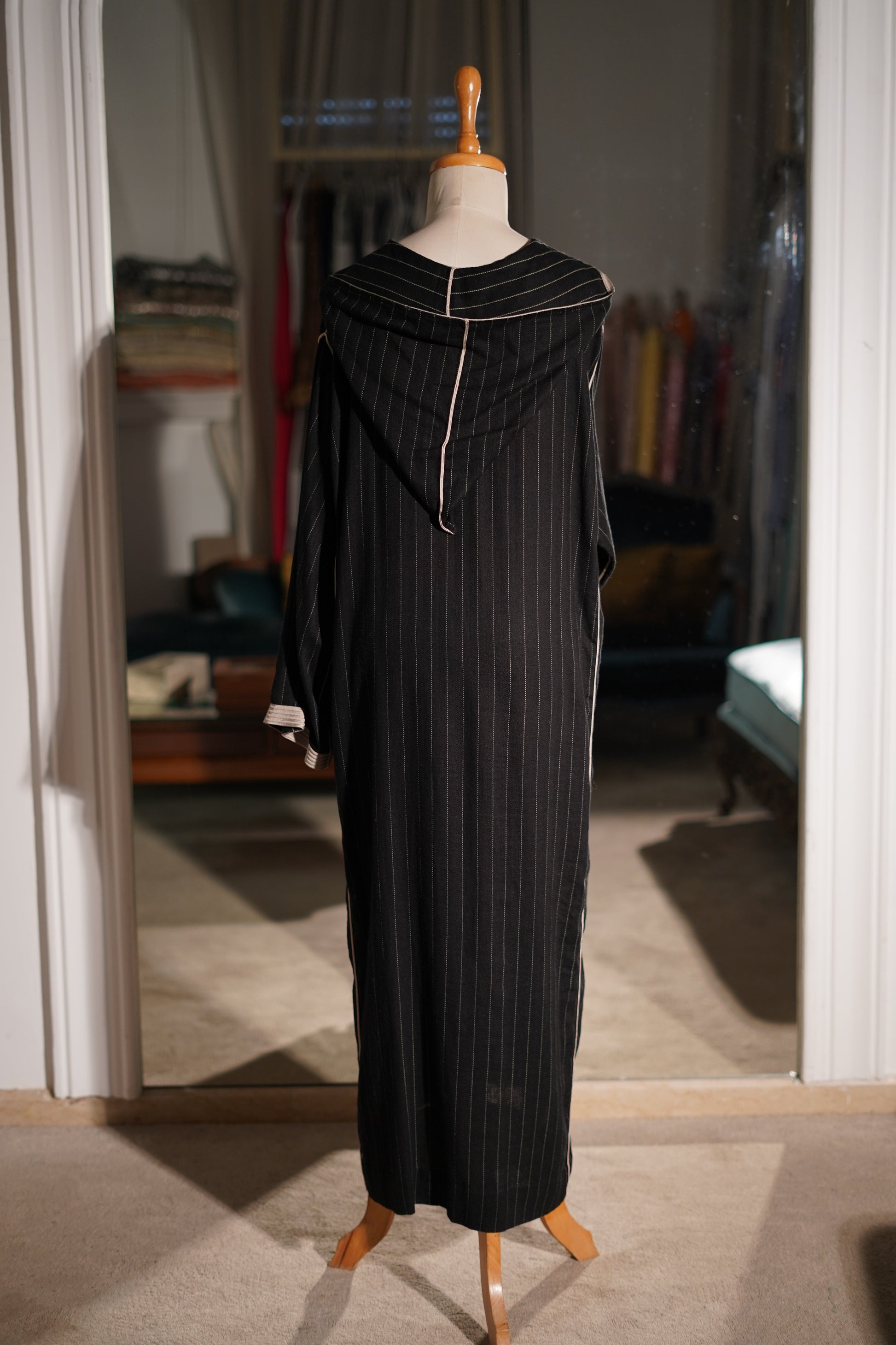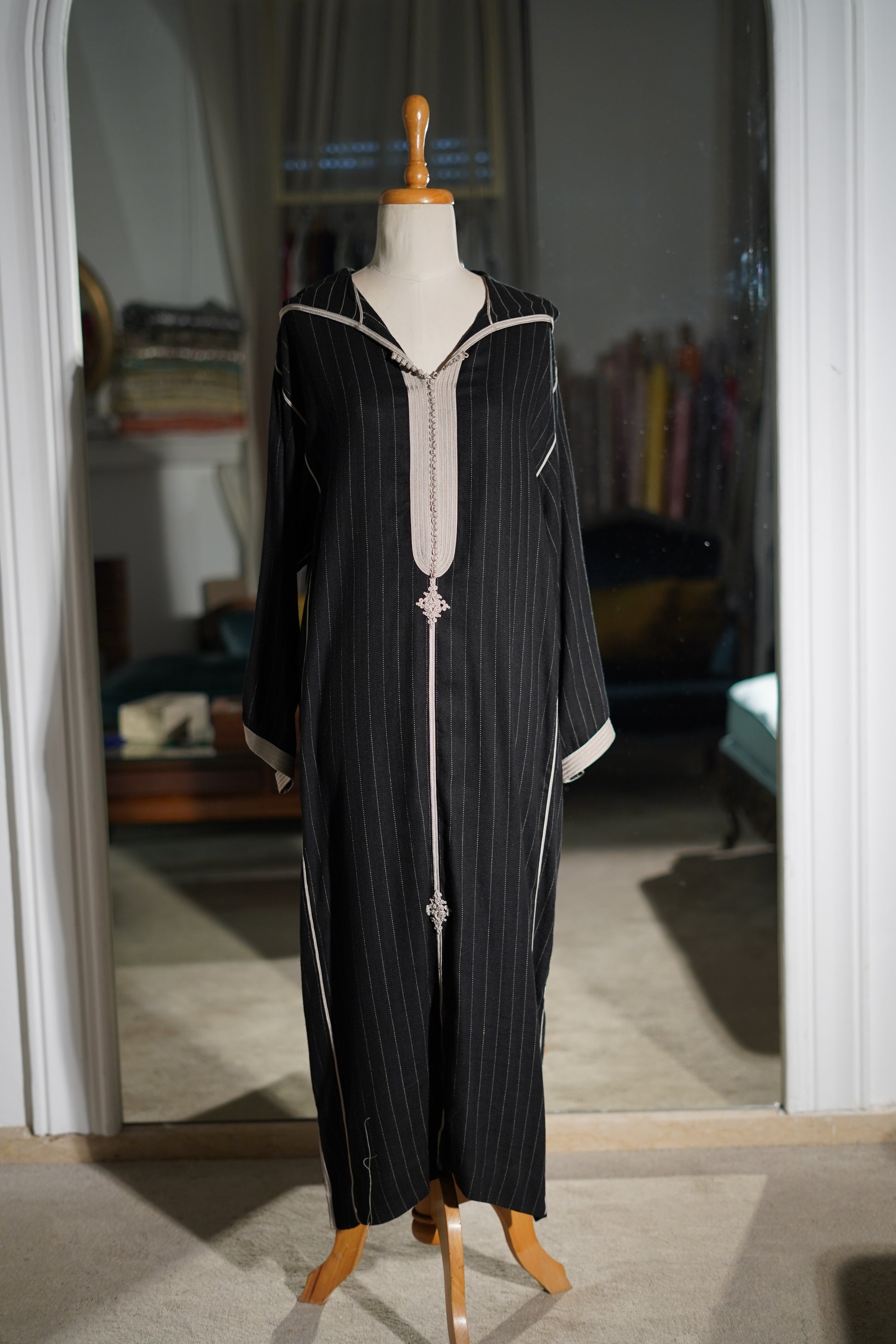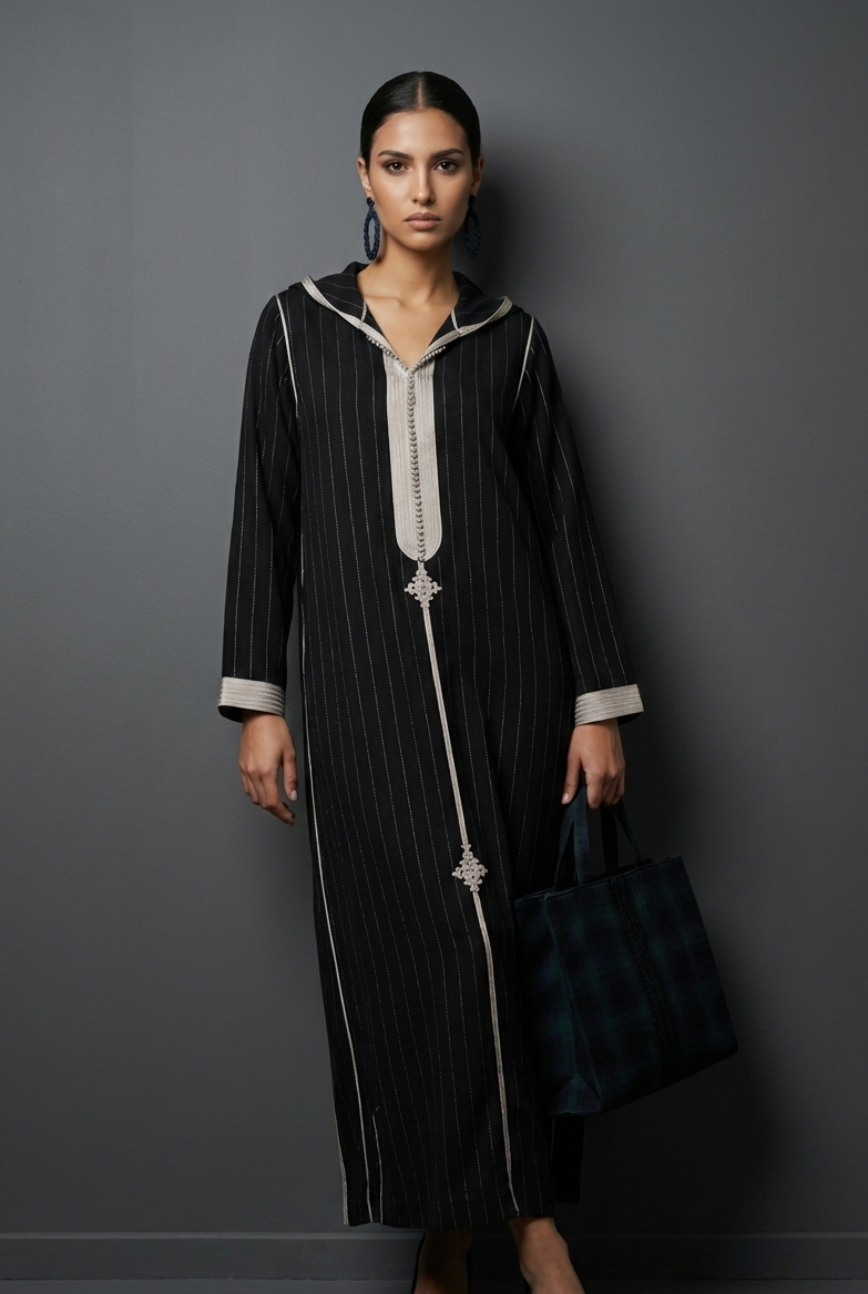 EN🇬🇧: A striking black jellaba with fine pinstripe detailing and contrasting ivory trim along the neckline and cuffs. The classic hooded design features elegant embroidered accents, creating a refined look perfect for sophisticated evening gatherings.