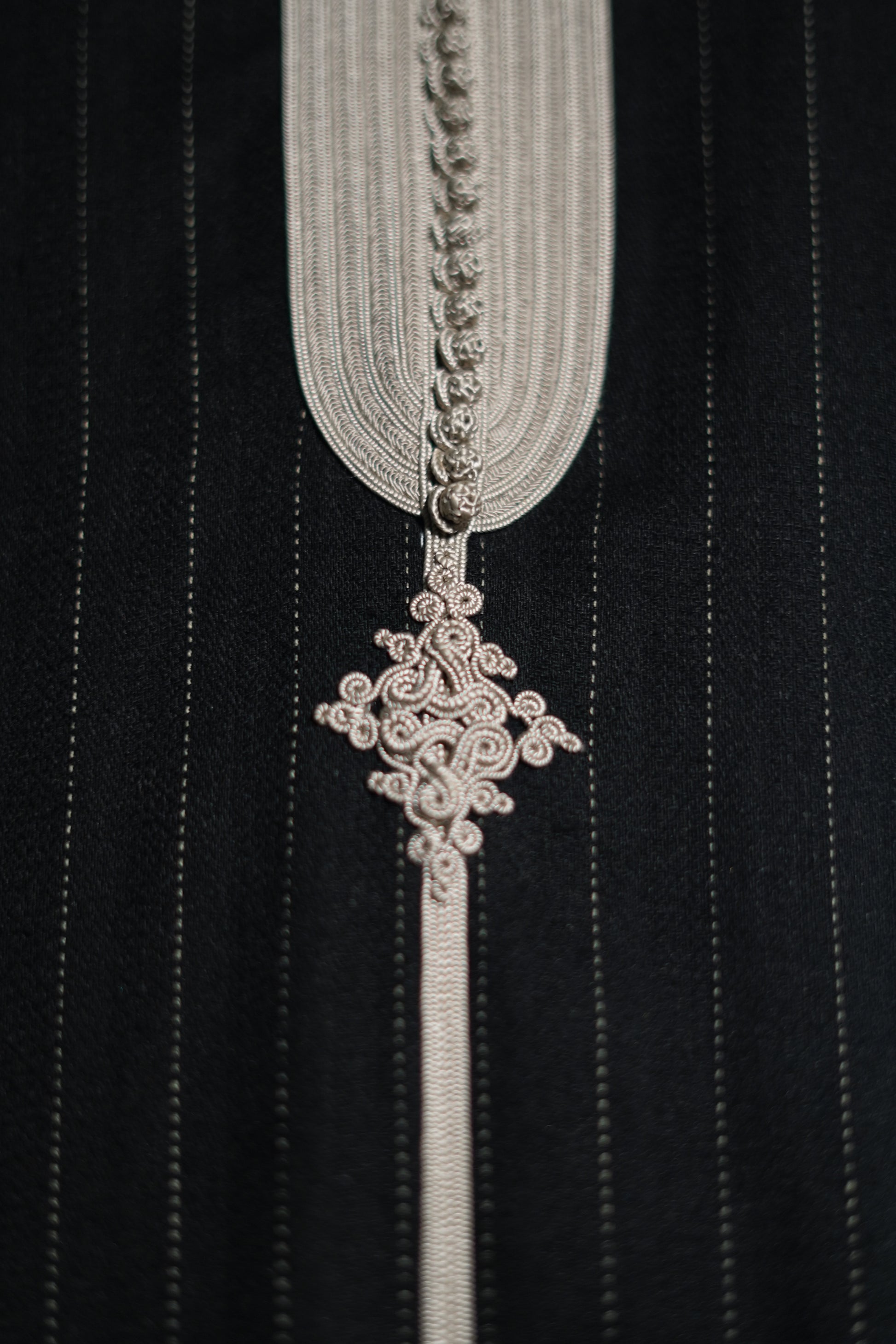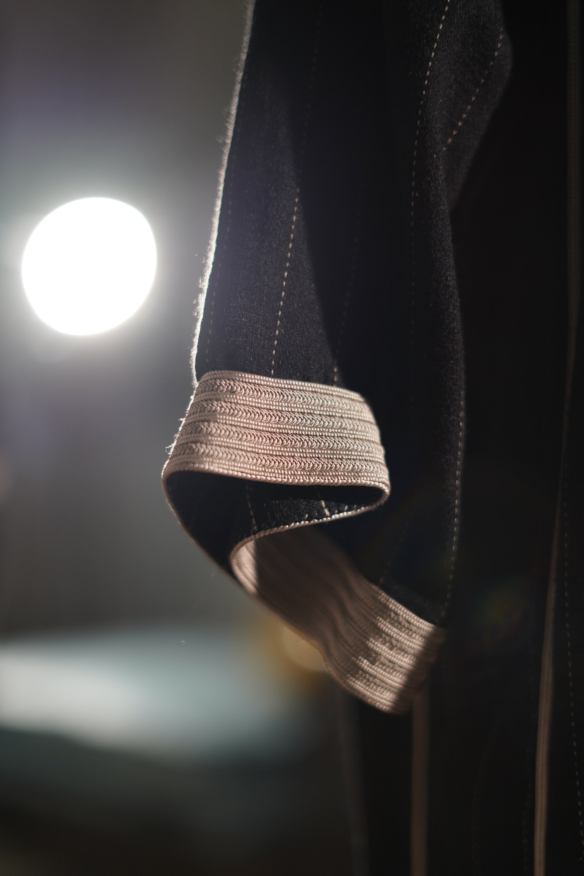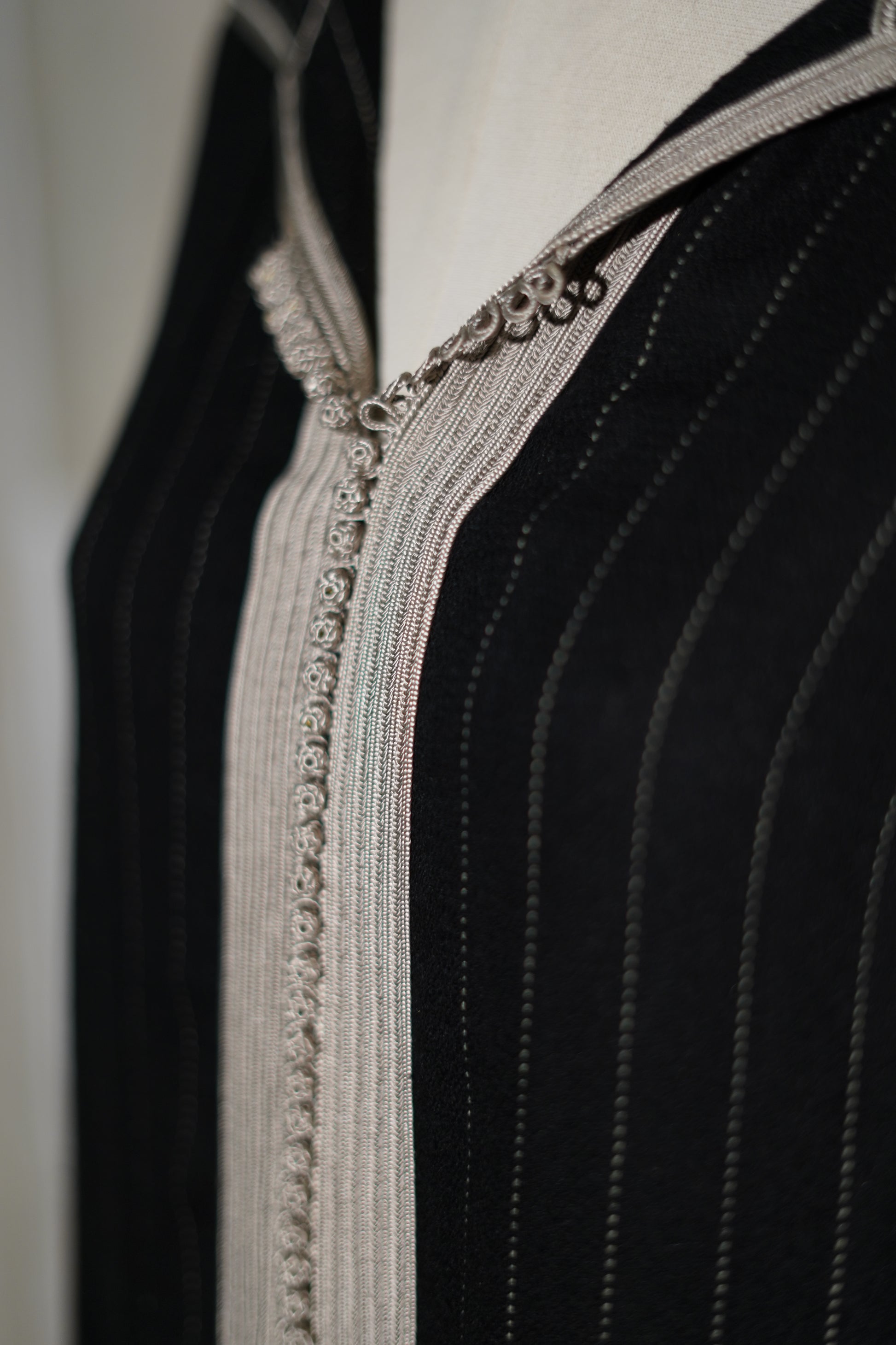 EN🇬🇧: A striking black jellaba with fine pinstripe detailing and contrasting ivory trim along the neckline and cuffs. The classic hooded design features elegant embroidered accents, creating a refined look perfect for sophisticated evening gatherings.