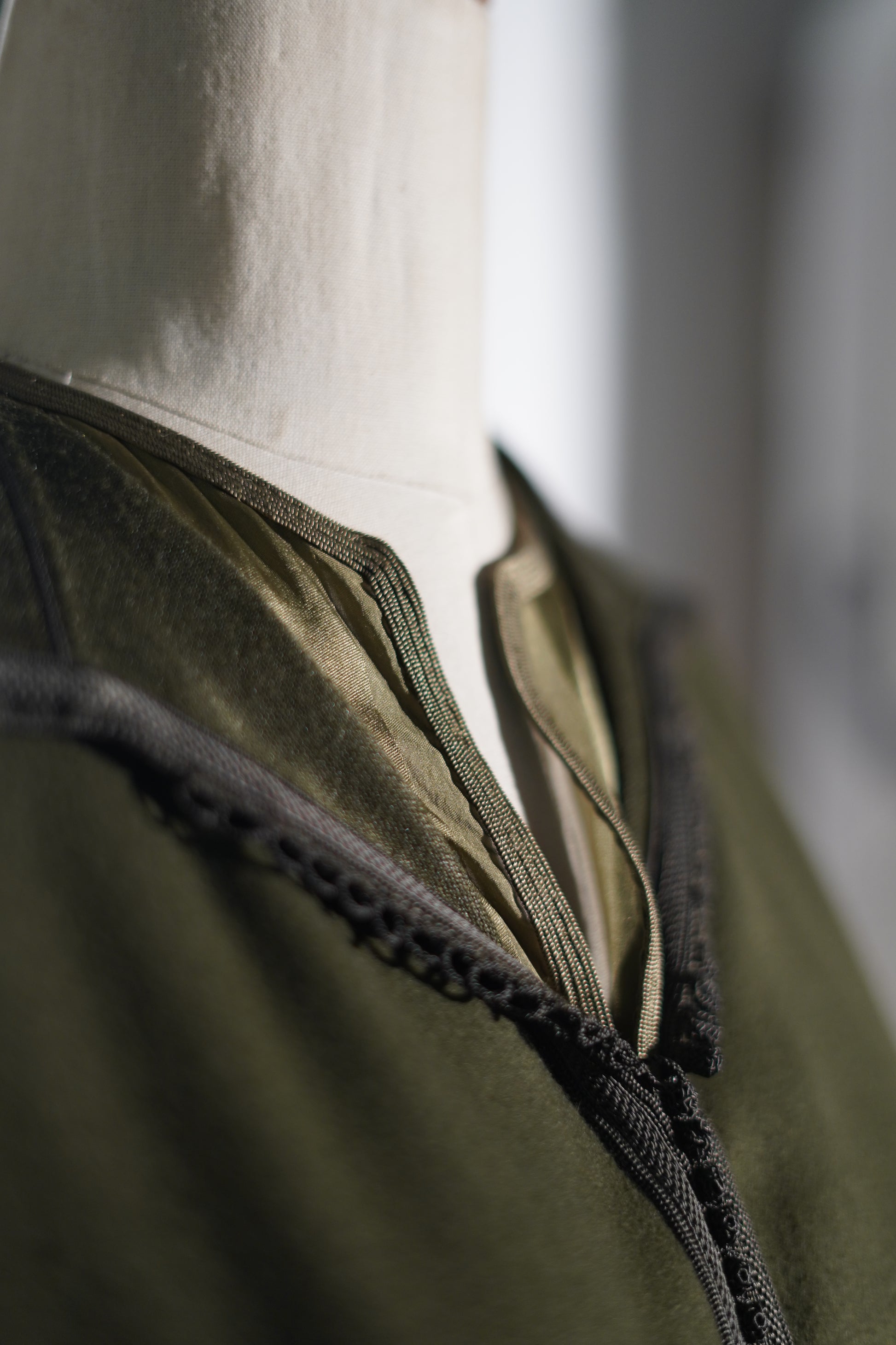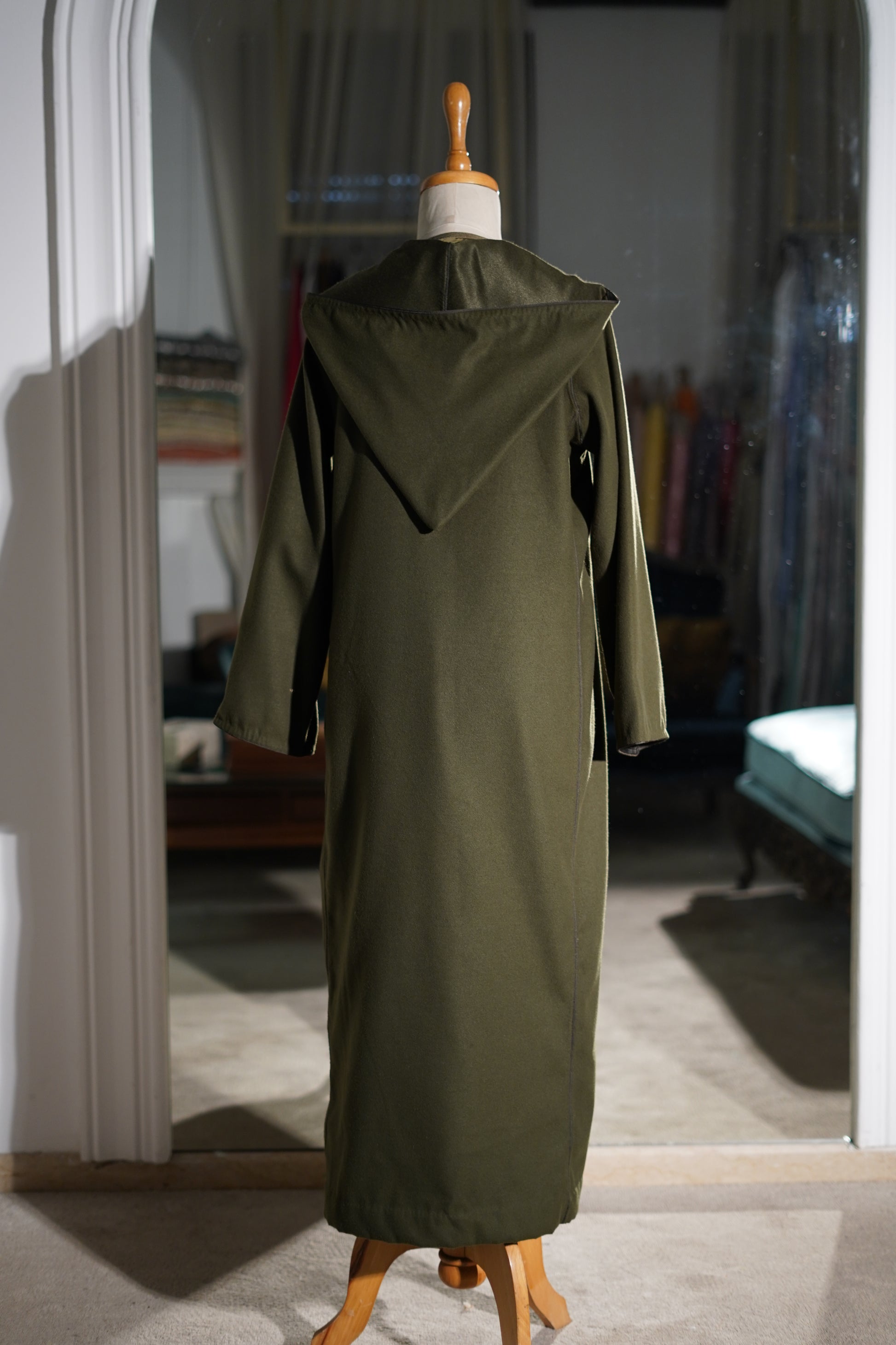 FR🇫🇷: Une djellaba olive profond au subtil reflet satiné avec des empiècements contrastants à l'ourlet. La couleur riche et le drapé élégant créent un look sophistiqué pour les célébrations du Ramadan et les fêtes de l'Aïd.