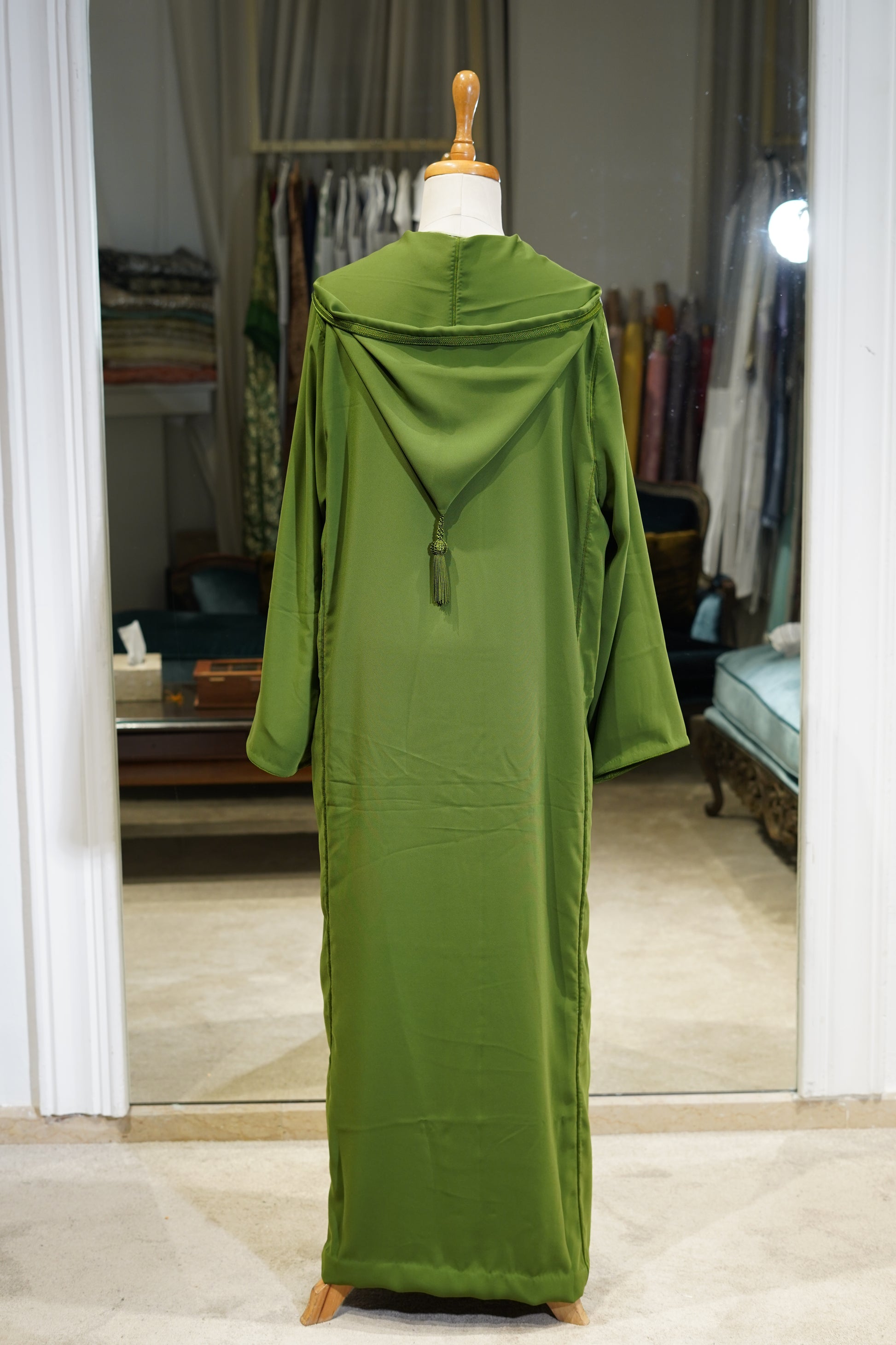 FR 🇫🇷: Une djellaba vert pistache à la silhouette épurée et minimaliste, ornée d'une sfifa tressée délicate. La couleur fraîche et les lignes fluides offrent une élégance décontractée avec une touche de luxe au quotidien.